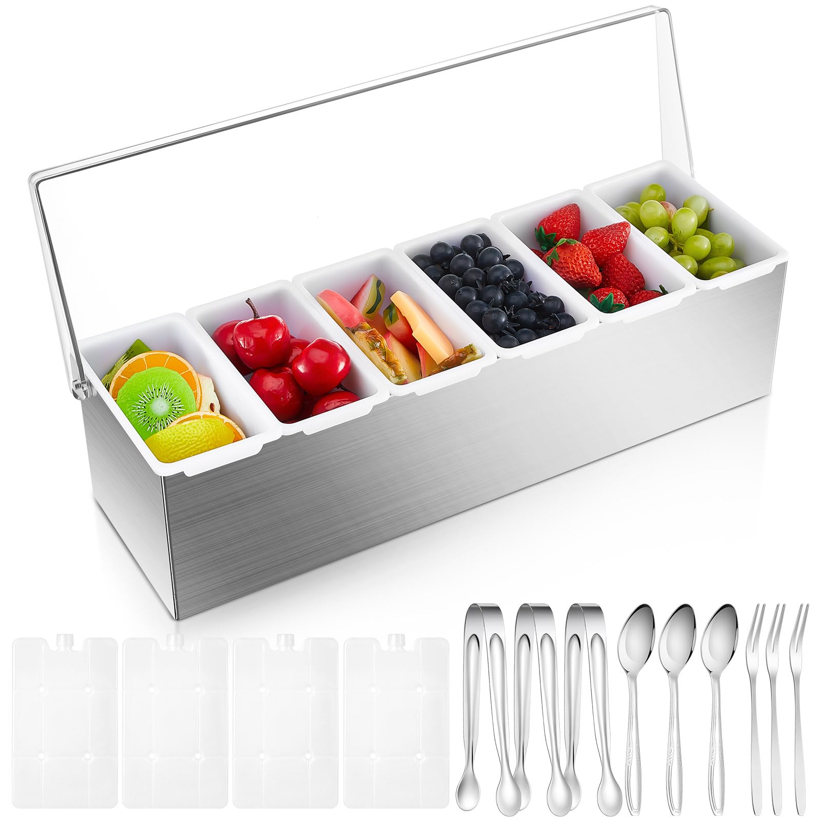 Servidor de condimentos de 5 compartimentos, recipientes de condimentos enfriados con hielo con tapa con bisagras con 5 platos ext