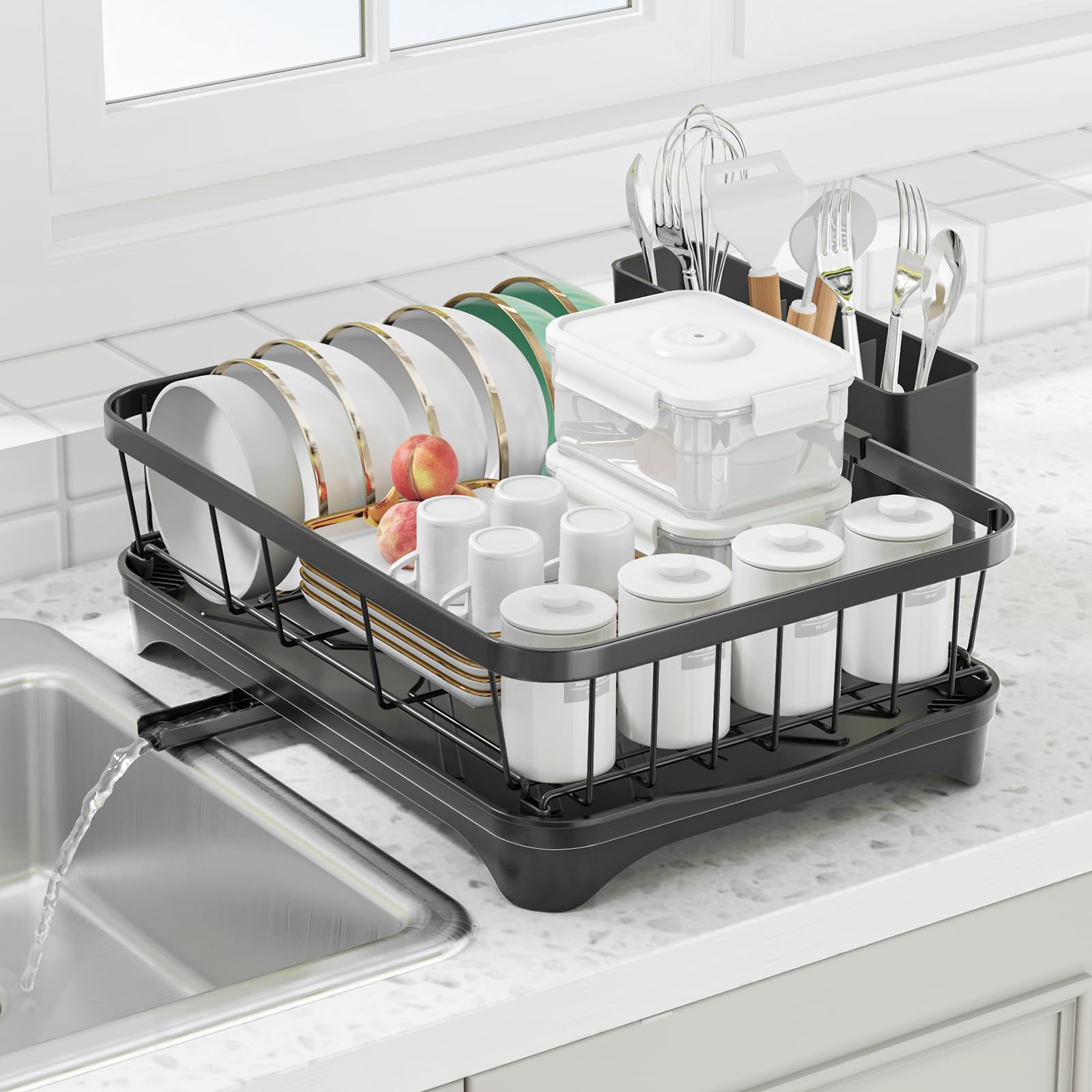 GAXmi Escurridor de platos sobre el fregadero con soporte para utensilios, soporte para tazas, 2 niveles, color negro