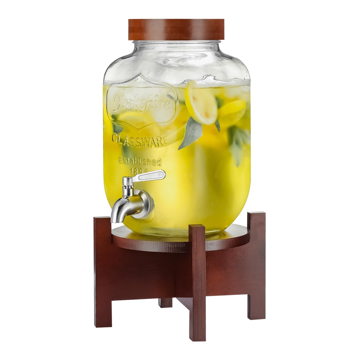 Dispensador de bebidas de vidrio con soporte y tapa de madera de acacia, dispensador de bebidas de 1 galón con grifo de acero inox