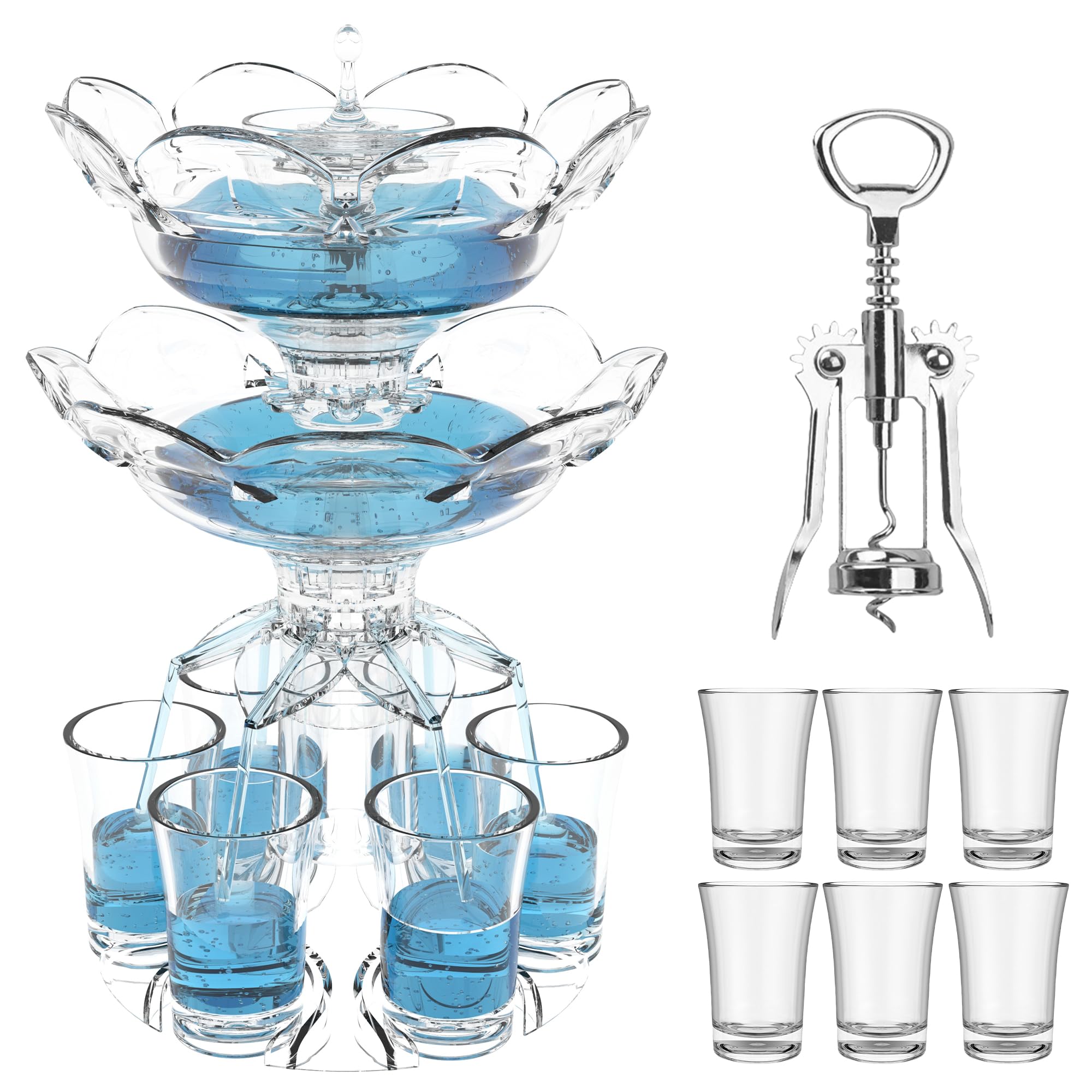 ALEVMOOM Dispensador de bebidas de doble capa con 6 vasos de chupito y soporte con abridor de botellas, juego de vasos de chupito