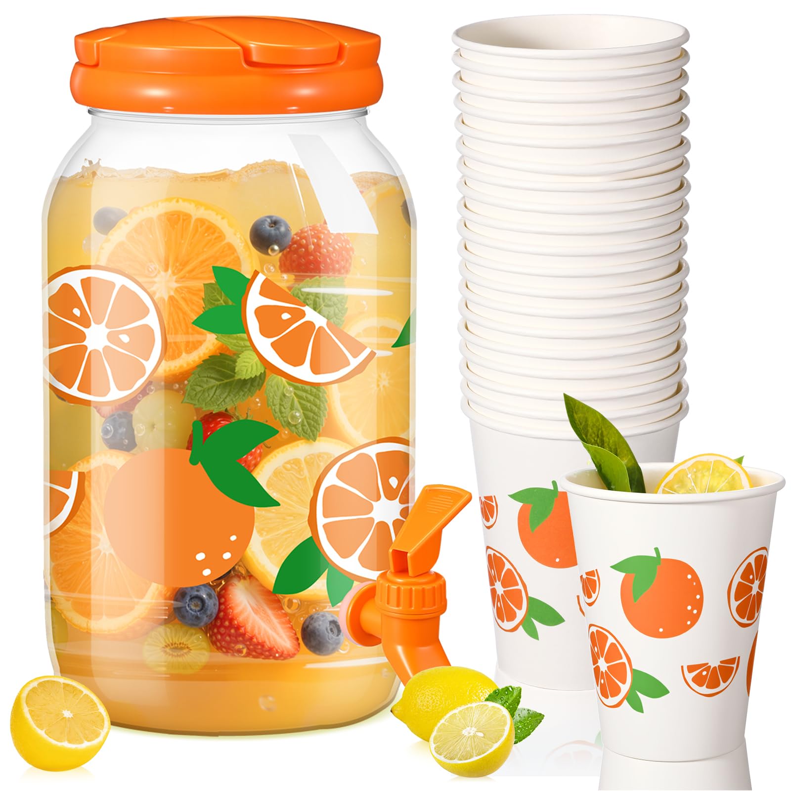 Umigy Dispensador de bebidas de plástico transparente con 20 vasos de papel tropical de 12 onzas, dispensador de bebidas de 1 galó
