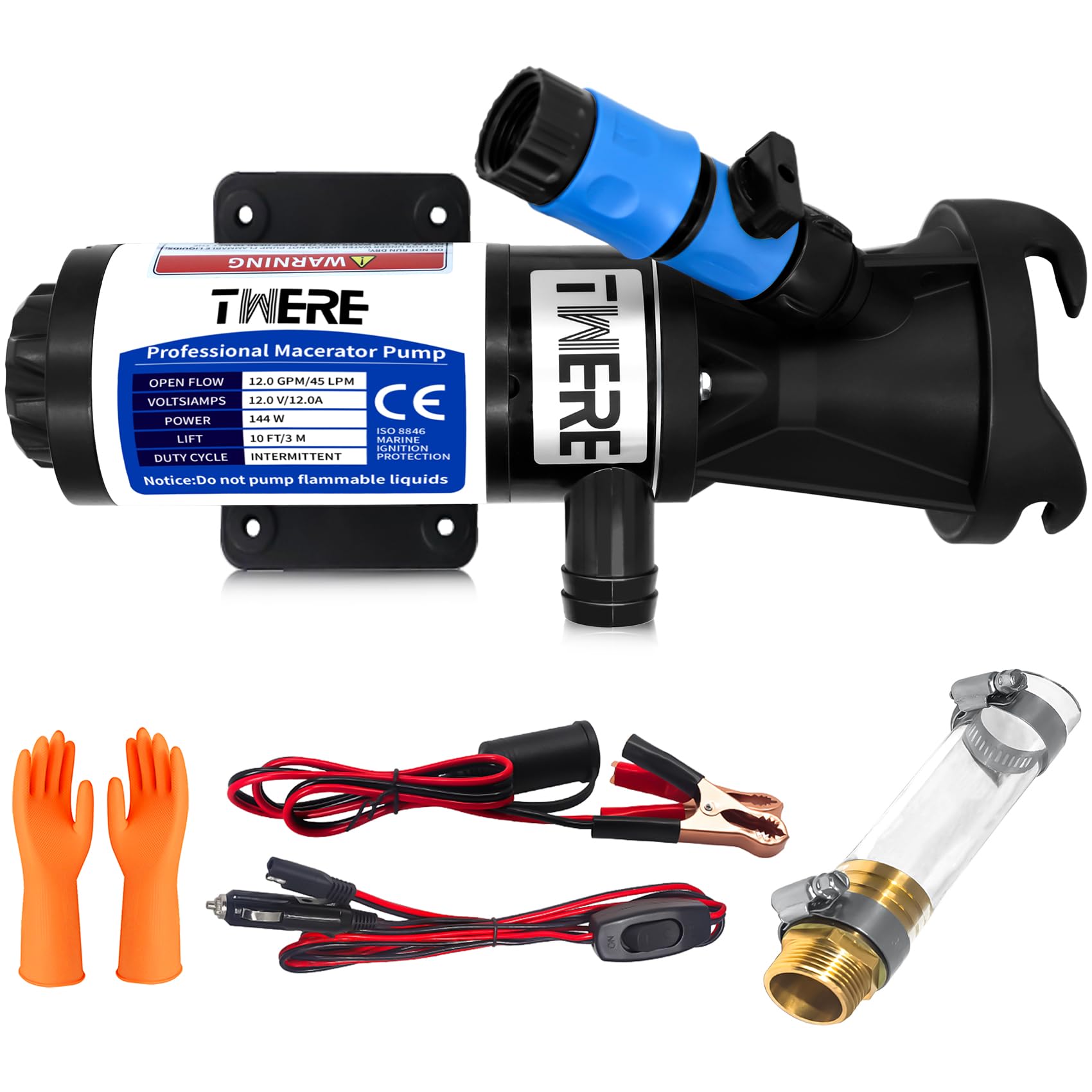 WASSERMANN Macerator – Bomba de residuos portátil de 12 V RV para aguas residuales, succión de 12.0 A, 12 GPM, elevación de 3.2 pi