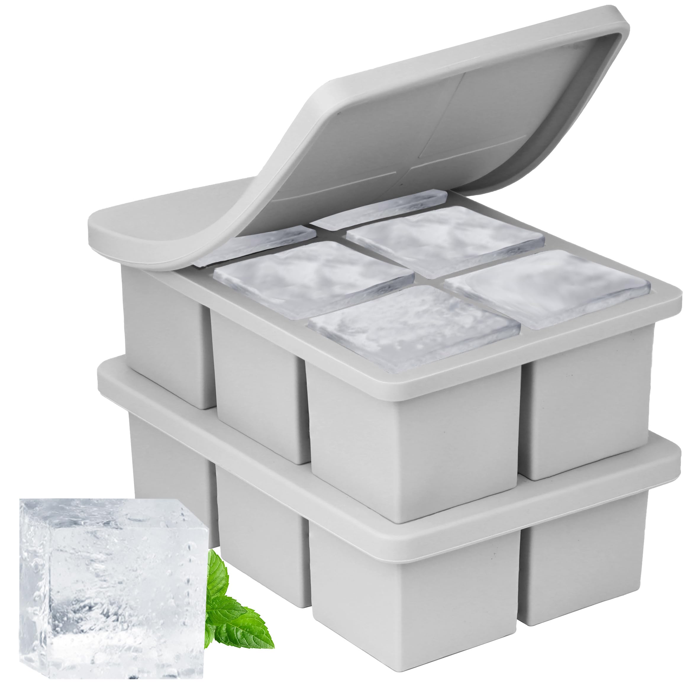 Wanderworld Combo de bandeja de hielo, molde de silicona reutilizable para congelador de hielo grande de 2 pulgadas, bandeja para