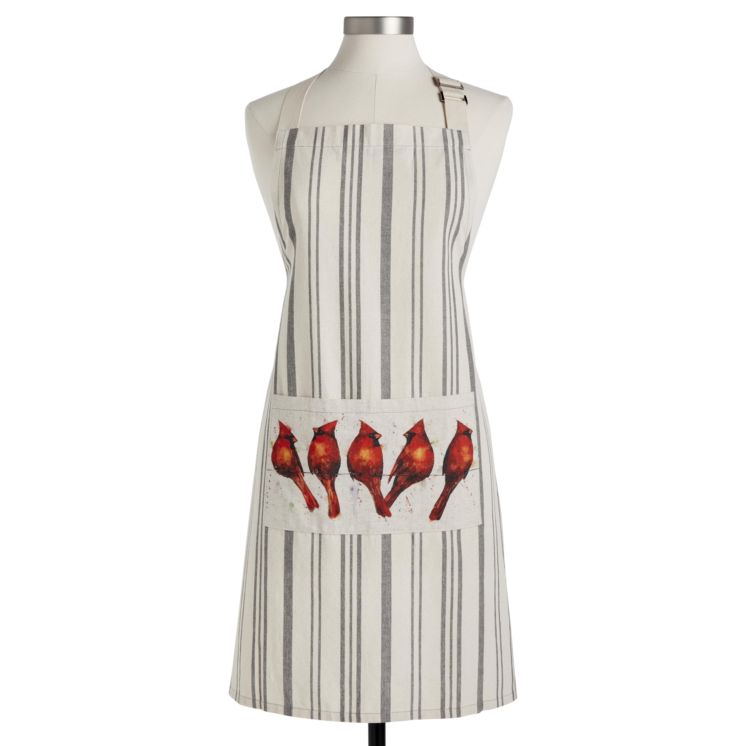 DEMDACO Dean Crouser Collection – Delantal de cocina de lino y algodón con diseño de cardenal rojo sobre alambre y rayas grises pa