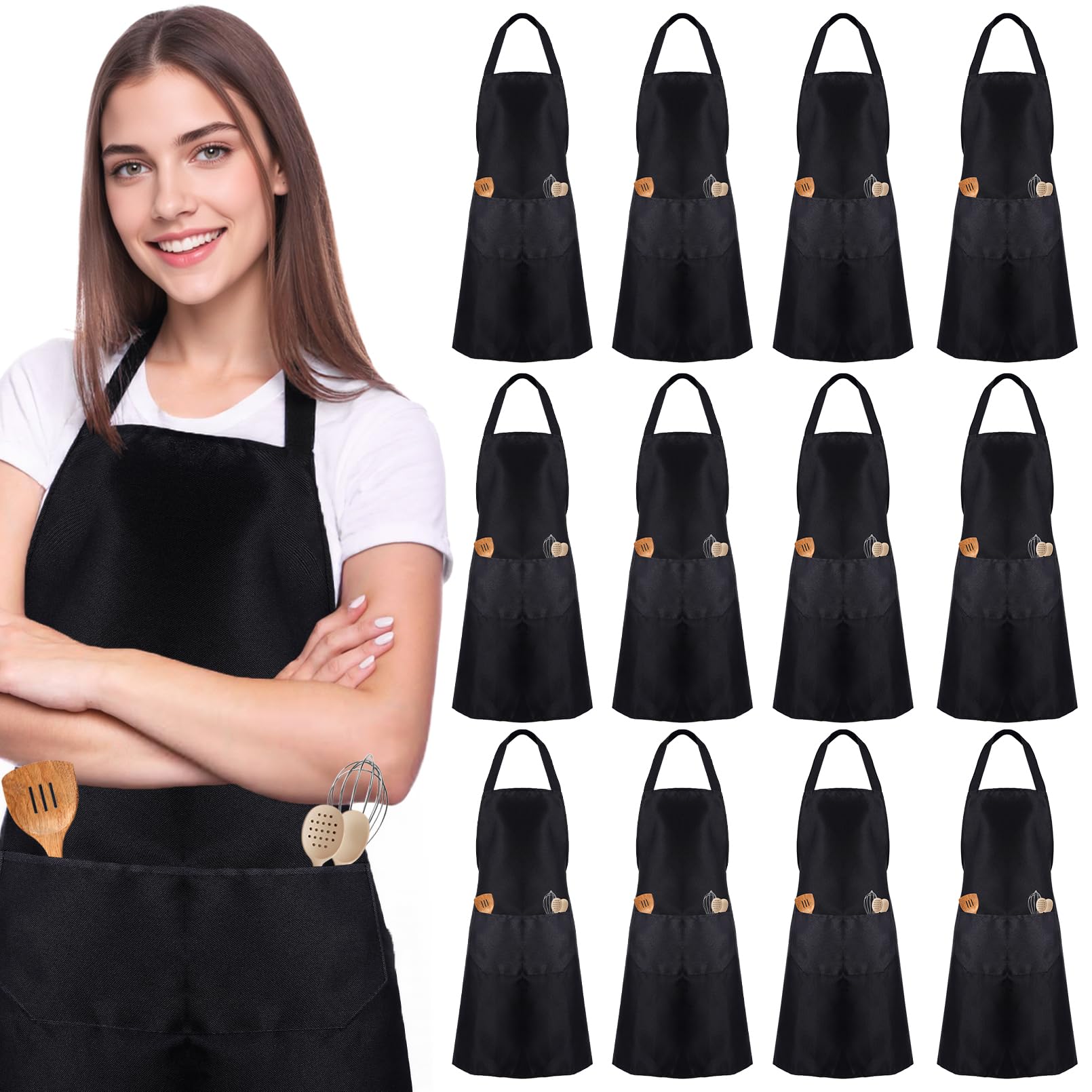 Paquete de 8/12/24 delantales lisos a granel, delantal comercial negro con 2 bolsillos, delantal unisex para adultos, pintura y ba