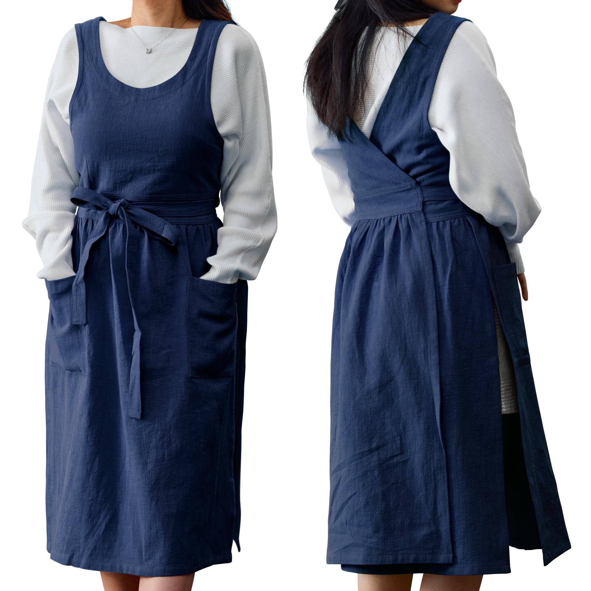 HANEE Delantal de lino con espalda cruzada para mujer con bolsillos, estilo japonés, coreano, sin atar, para cocina, jardín