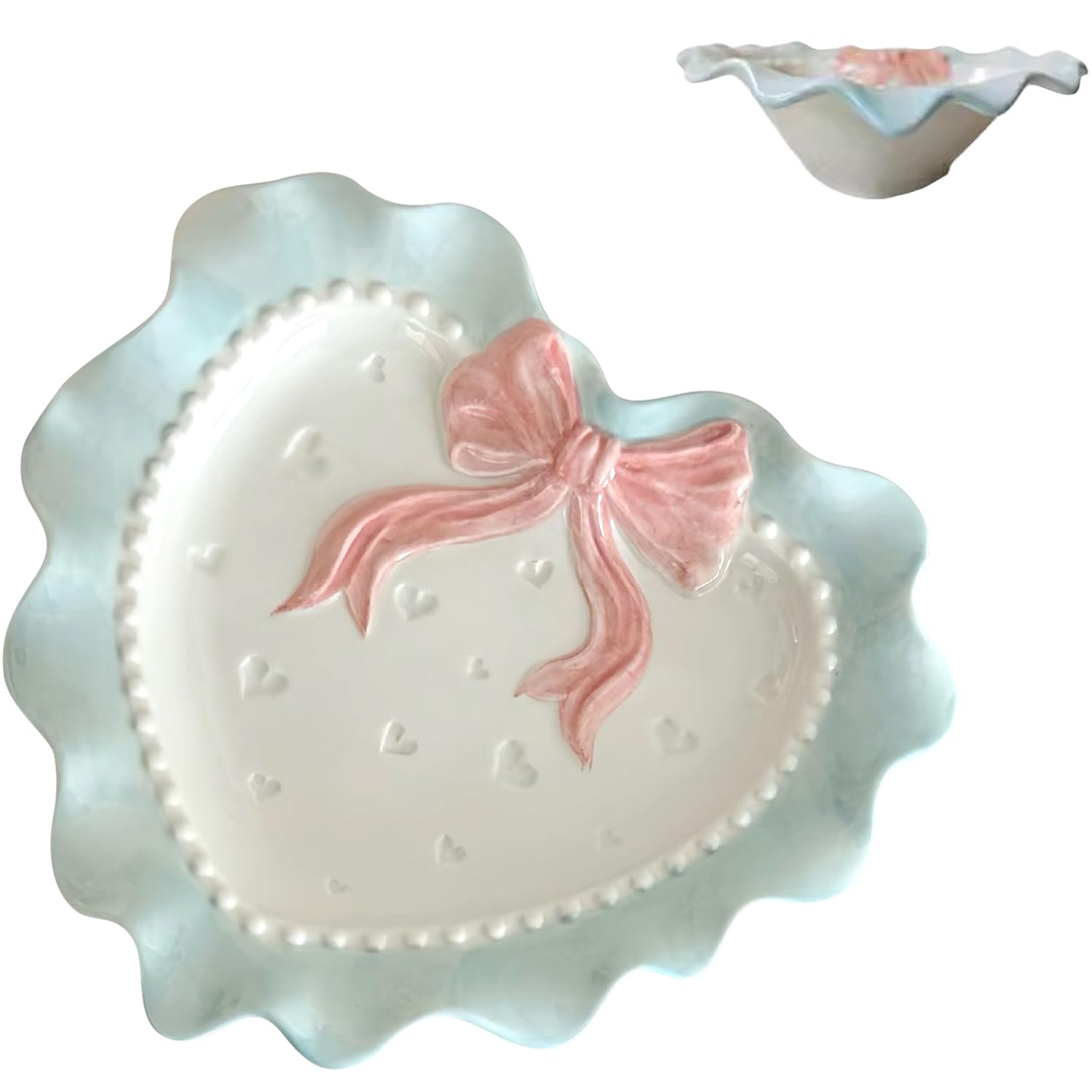 Plato de cerámica con forma de corazón, lindo lazo con nudo, plato decorativo en relieve, plato de postre irregular, plato de cena