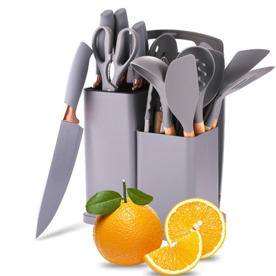Juego de utensilios de cocina y bloque de cuchillos de 19 piezas: 12 utensilios de cocina de silicona antiadherentes y resistentes