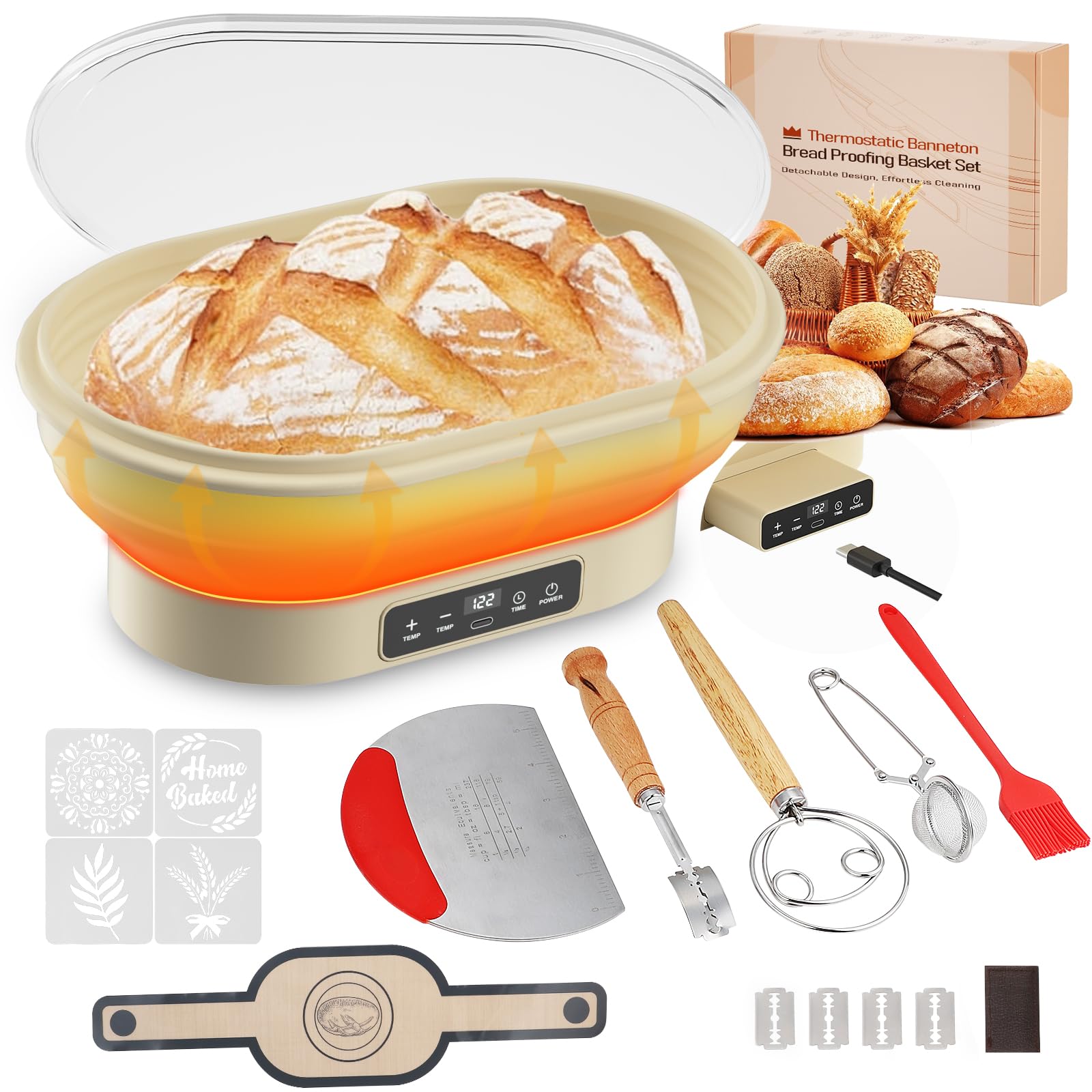 Banneton – Juego de cestas a prueba de pan, cuenco termostático mejorado a prueba de pan con temporizador, 10 pulgadas ovaladas de
