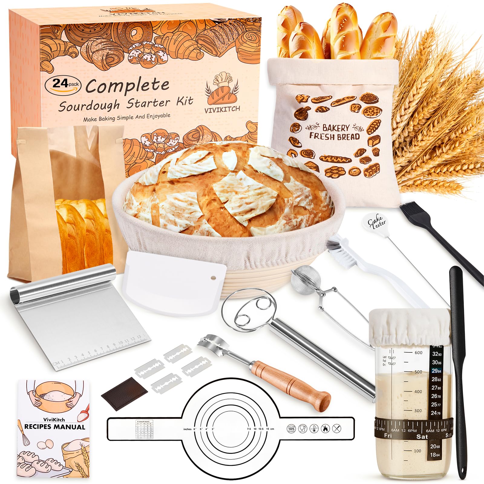 Kit completo de iniciación de masa madre – 24 piezas de suministros para hornear pan para cocina moderna, cestas redondas de 9 pul