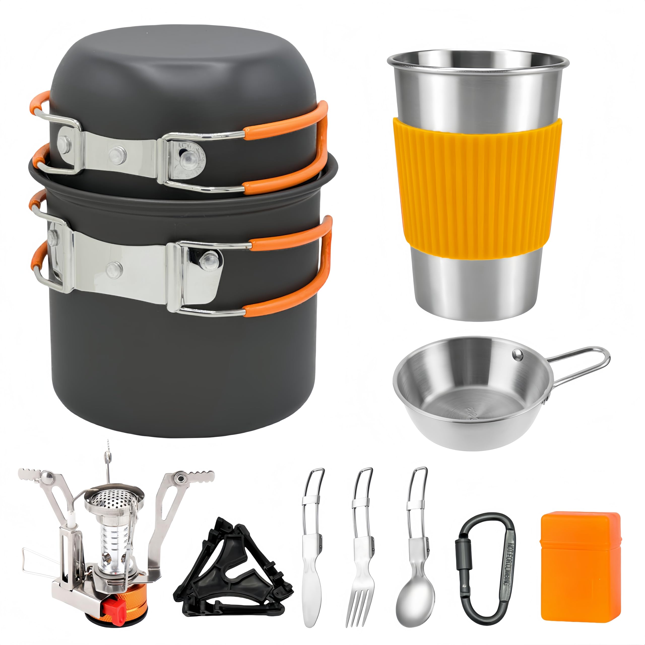 Kit de 10 utensilios de cocina para acampar, ollas de campamento de 1.2 L y 0.6 L con estufa, tenedores, cuchillos, cucharas, taza