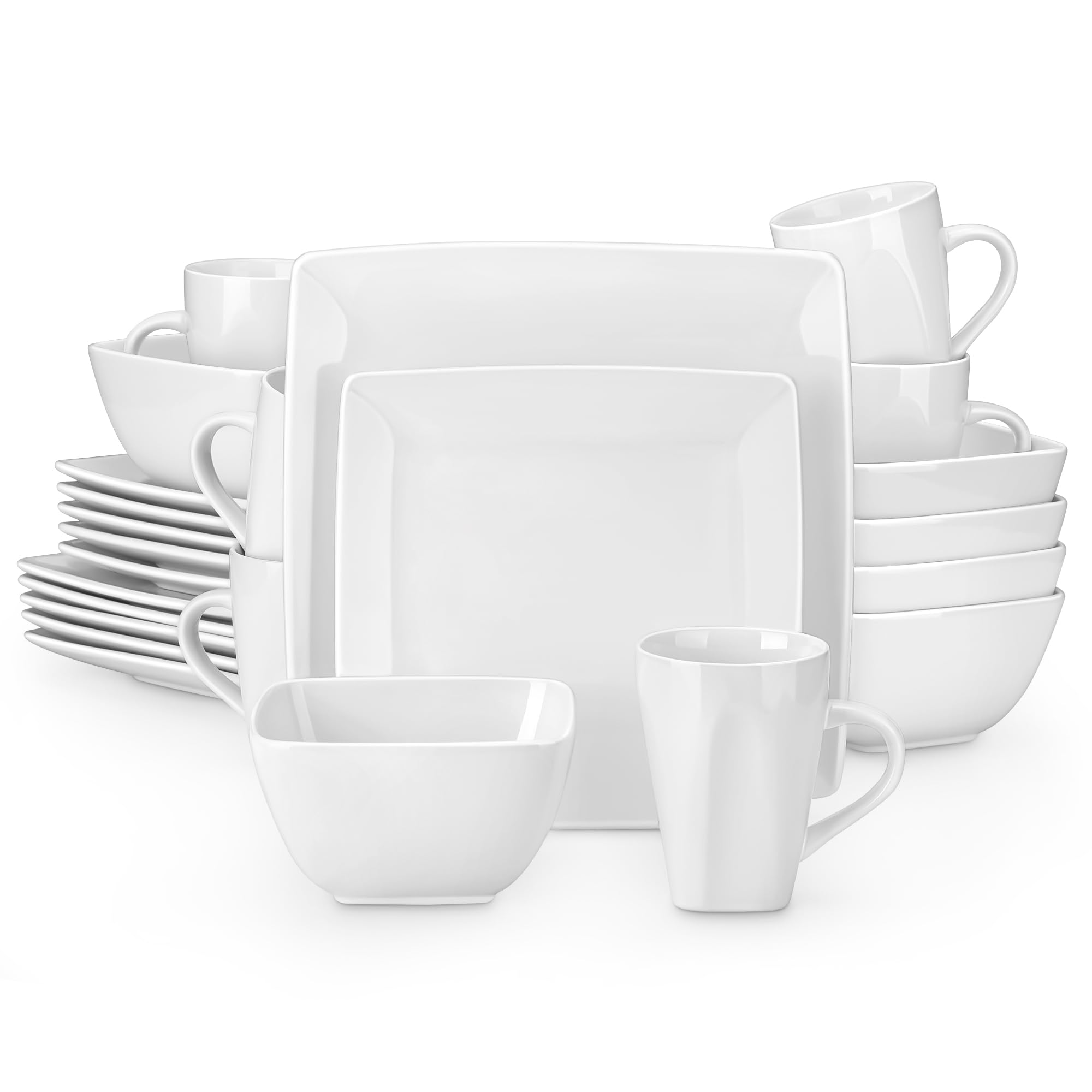 vancasso Soho – Juego de vajilla de 24 piezas, juego de platos cuadrados de gres blanco, platos de cena, platos de postre, tazas y