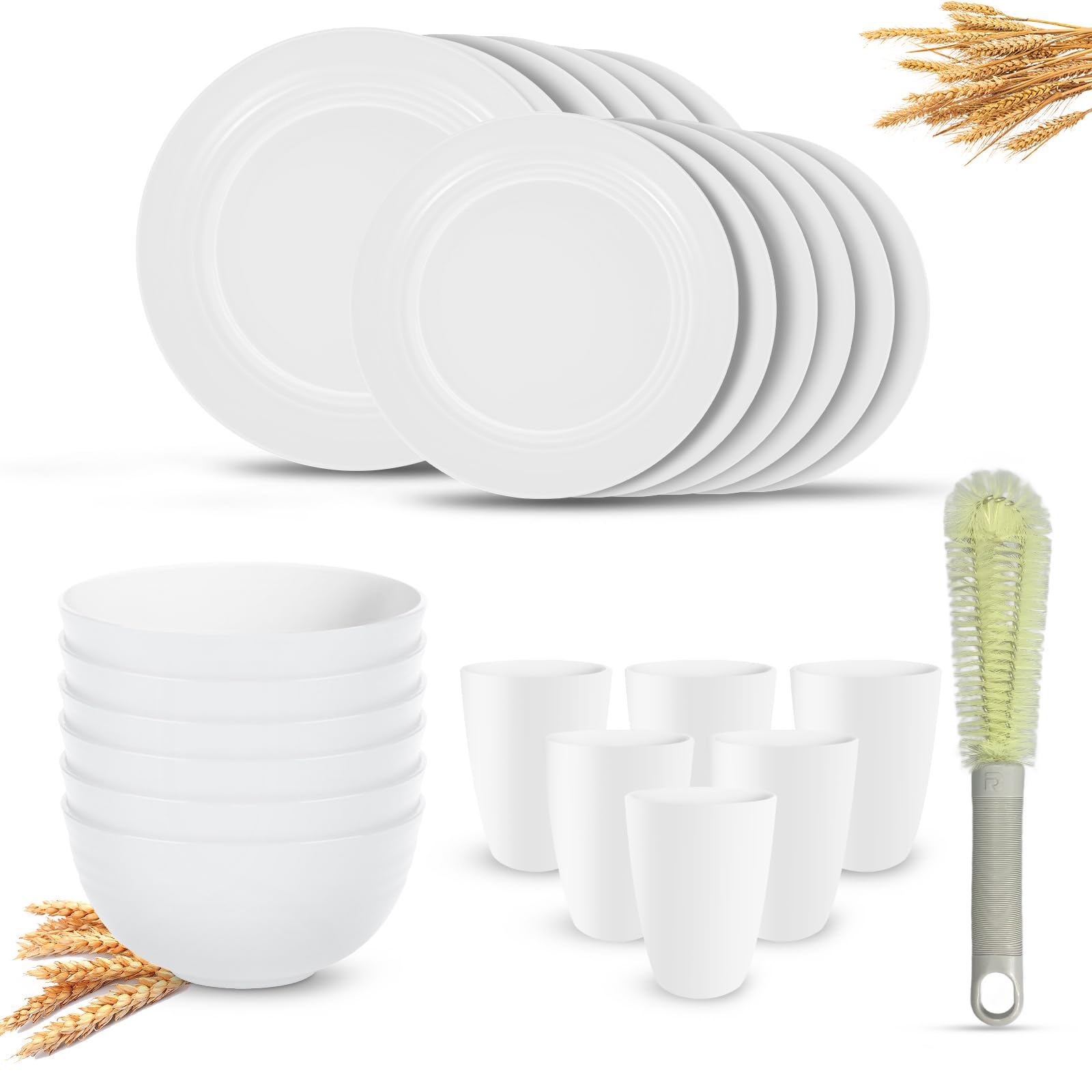 Juego de vajilla de paja de trigo de cocina (25 piezas) cepillo de limpieza adjunto, servicio para 6, juegos de platos y cuencos d