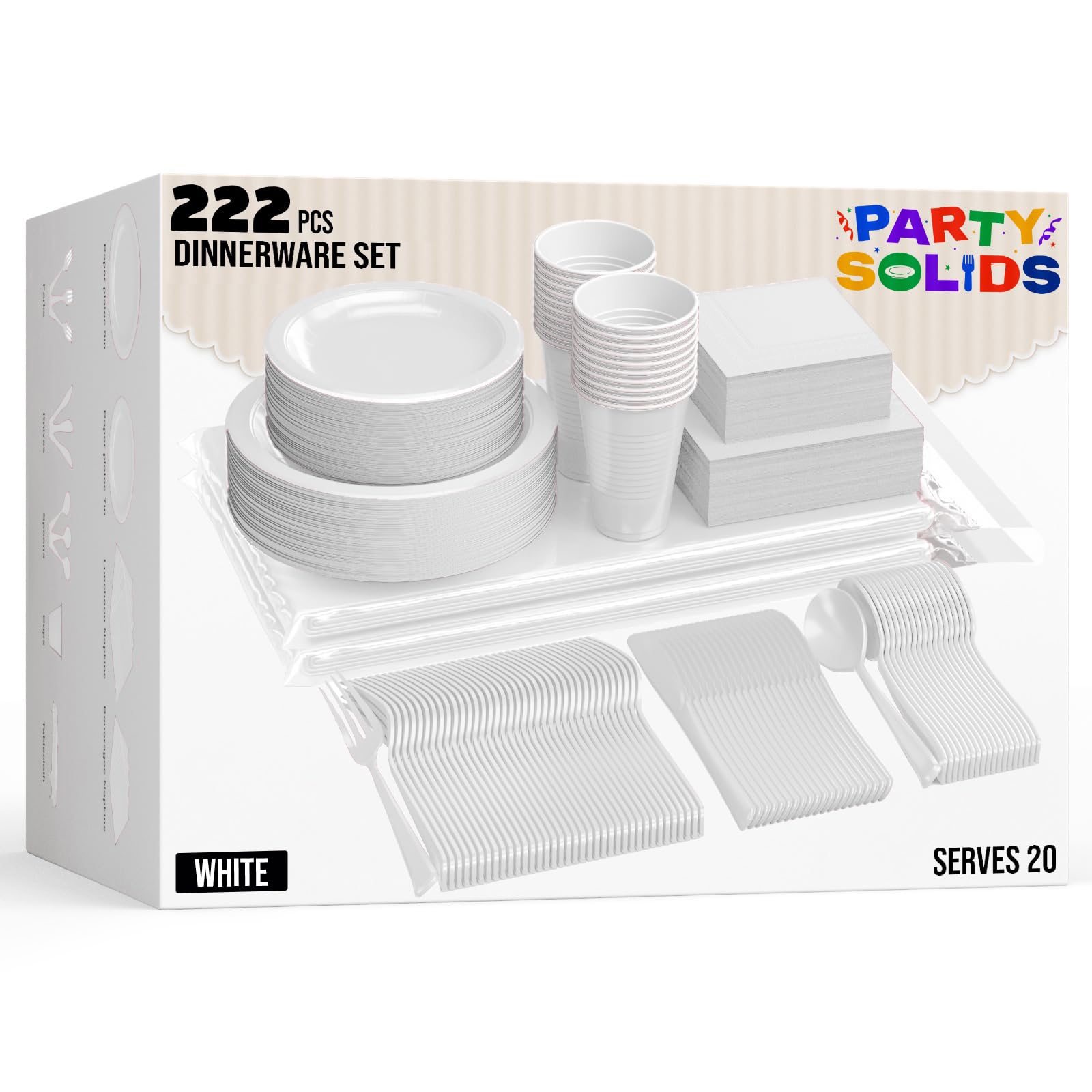 Juego de 222 platos y servilletas de papel blanco, platos desechables para fiestas, almuerzos y cócteles, vasos de plástico de 18