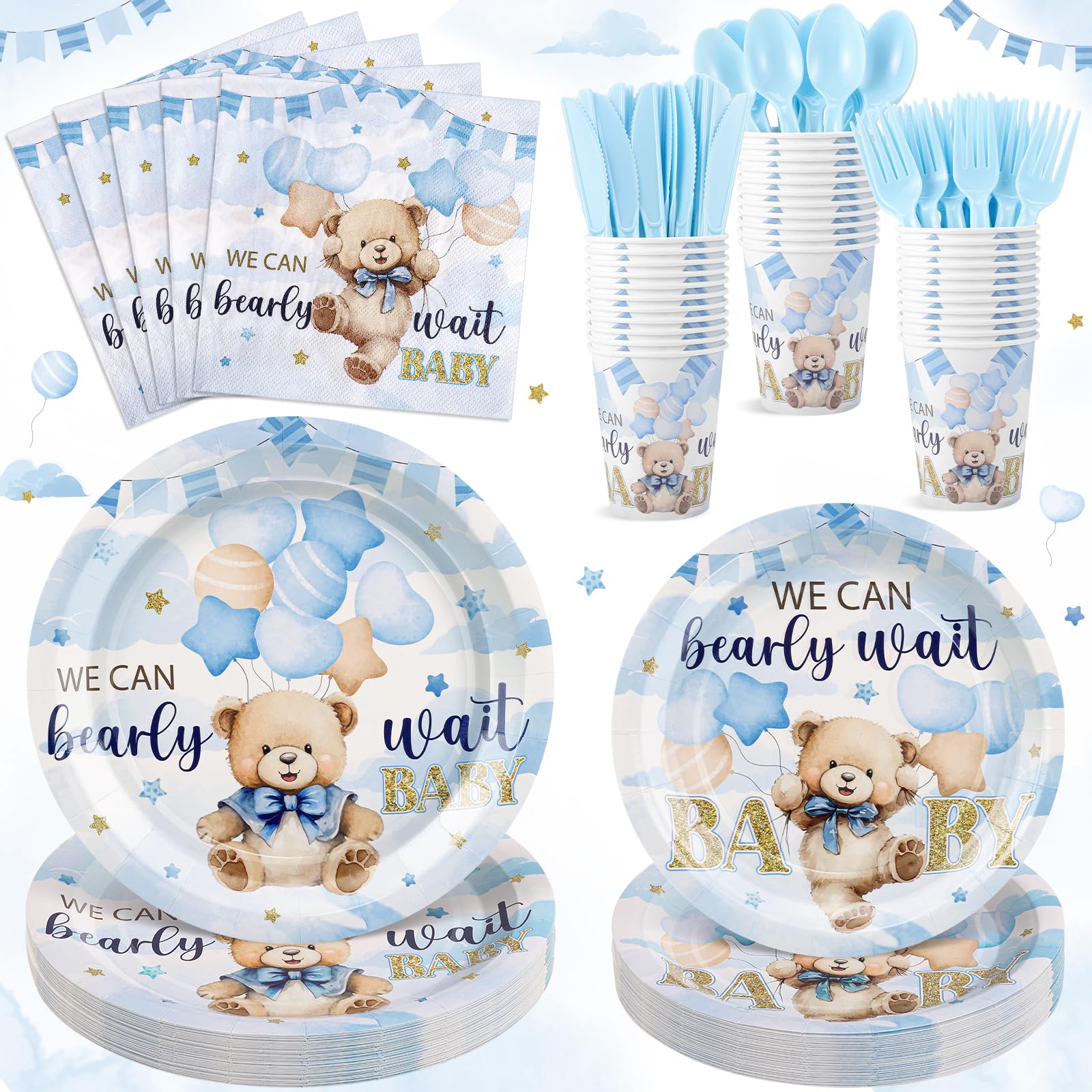 175 platos y servilletas de oso para baby shower, 25 invitados We Can Bearly Wait, decoraciones de baby shower, incluye platos par