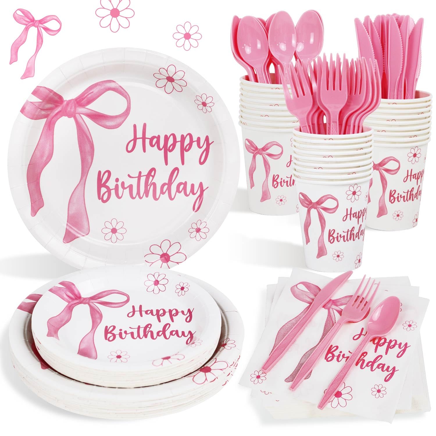 Juego de platos de decoración de fiesta de cumpleaños con lazo rosa para 25 invitados, 175 piezas de platos de papel para niña de