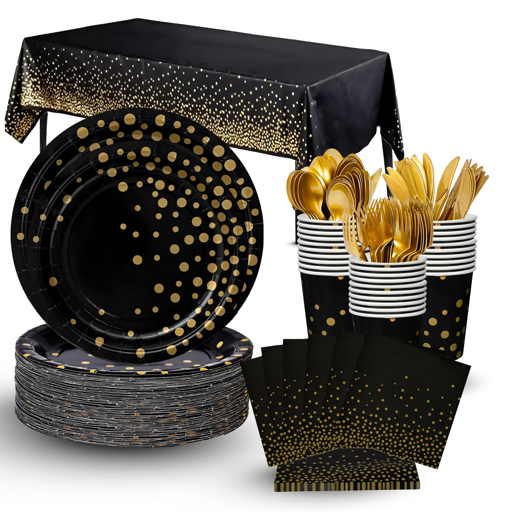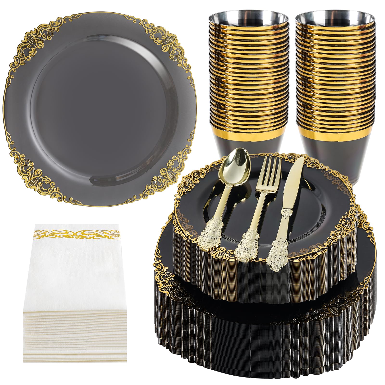 Juego de vajilla de plástico desechable de 350 piezas para 50 invitados, platos elegantes con adornos negros y dorados y cubiertos