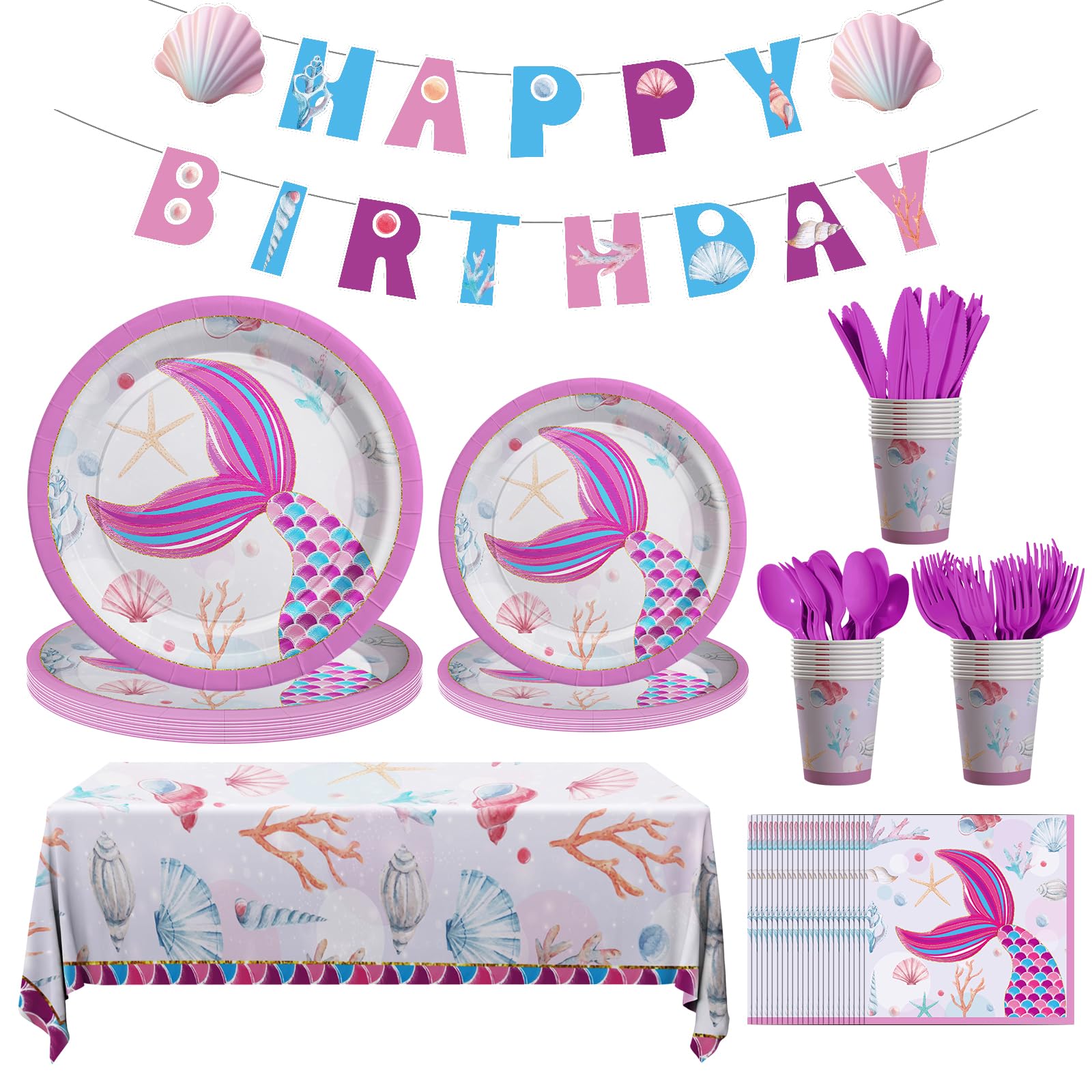 Decoraciones de cumpleaños de sirena, 170 piezas de suministros de fiesta de sirena, incluyendo pancarta, platos, vasos, servillet