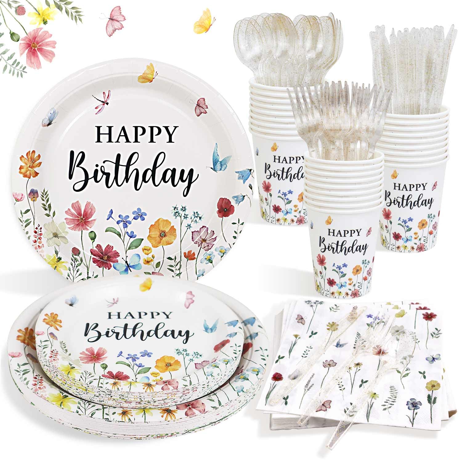 Juego de platos de decoración de fiesta de cumpleaños de verano, 25 invitados, platos de papel floral de flores silvestres, servil