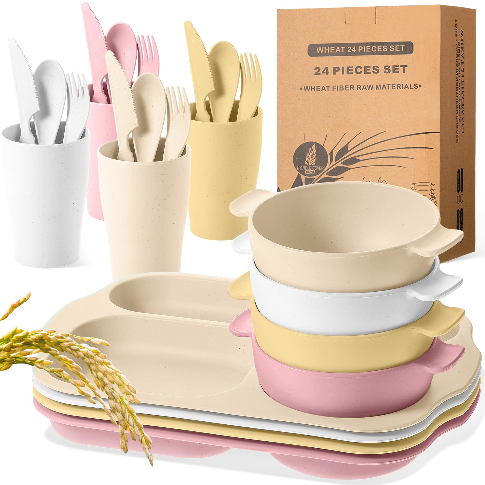 Juego de 24 cubiertos de paja de trigo para niños pequeños, incluye platos divididos, aptos para microondas, lavavajillas, vajilla