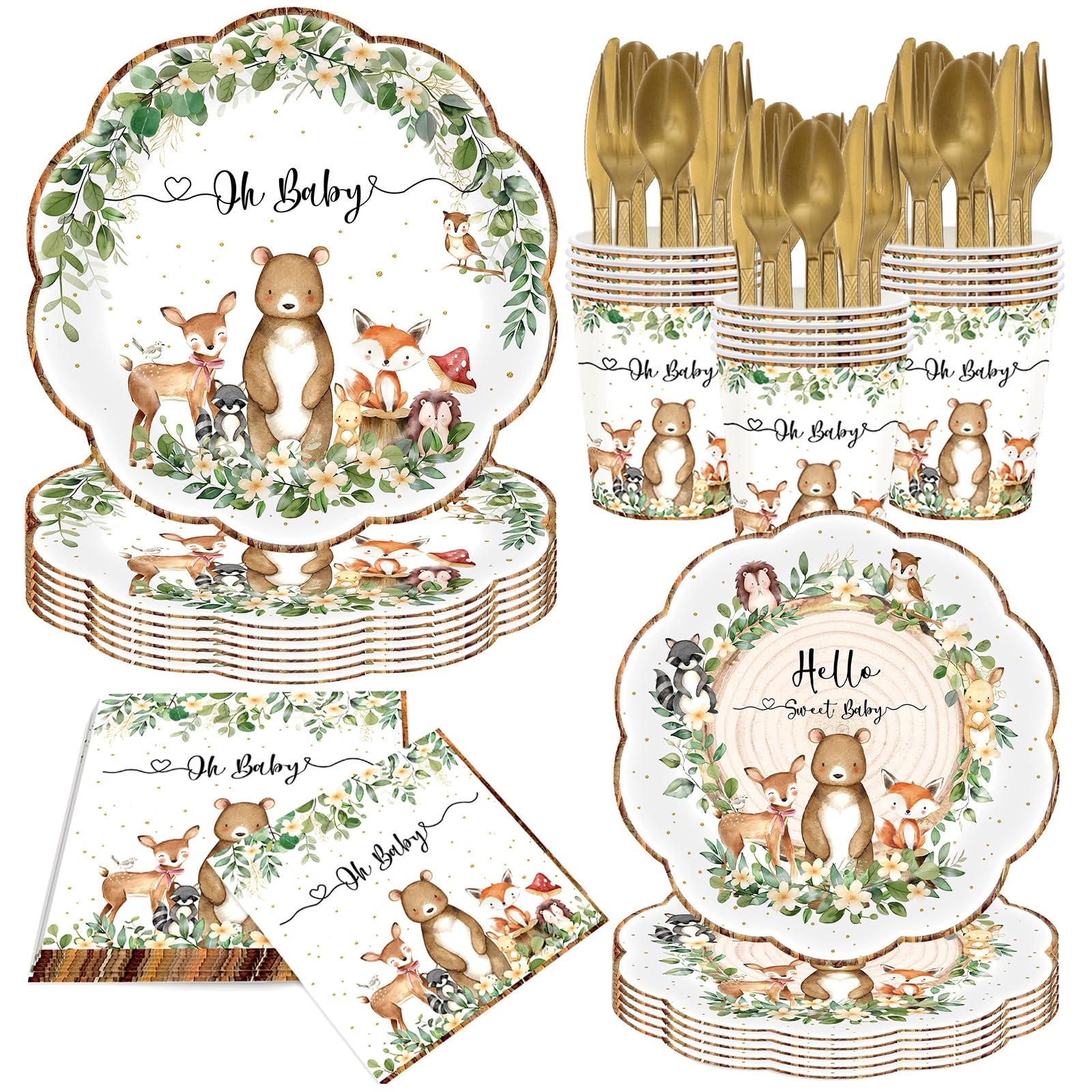 140 piezas de decoración de baby shower del bosque incluyen platos neutros de animales del bosque, servilletas, vasos, cubiertos,