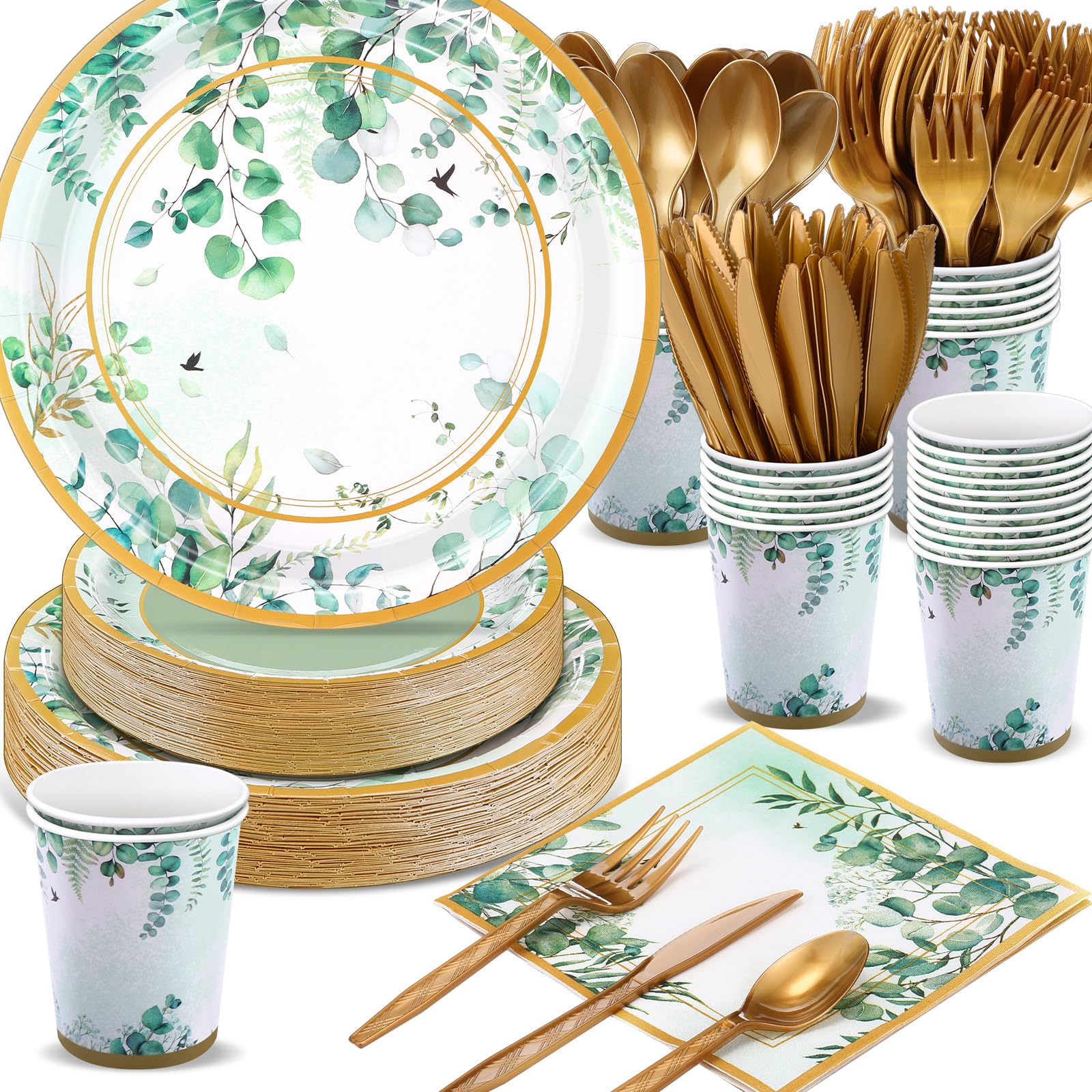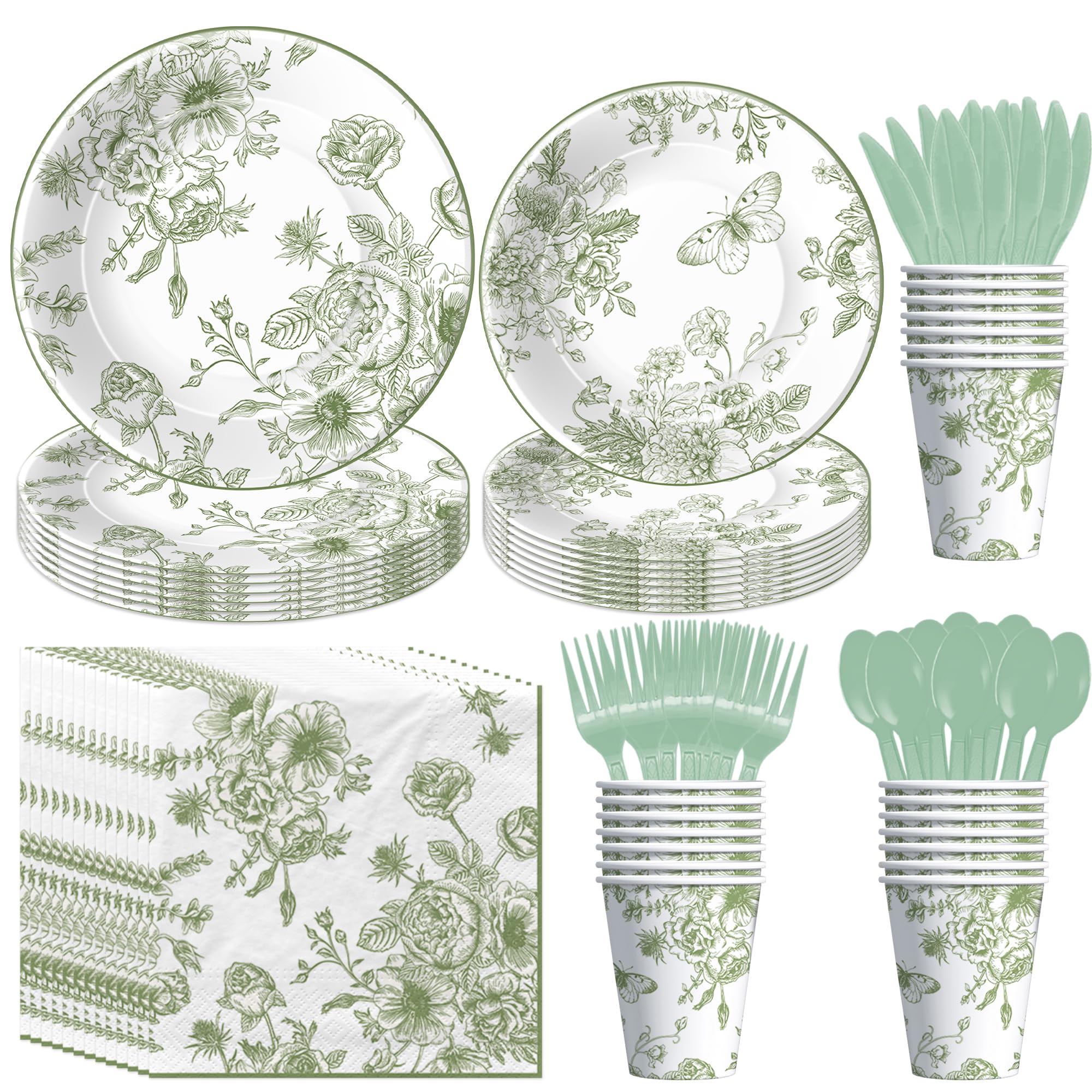 Juego de vajilla de 350 piezas para fiesta de té de primavera y verano, color verde salvia, platos desechables, servilletas, vasos