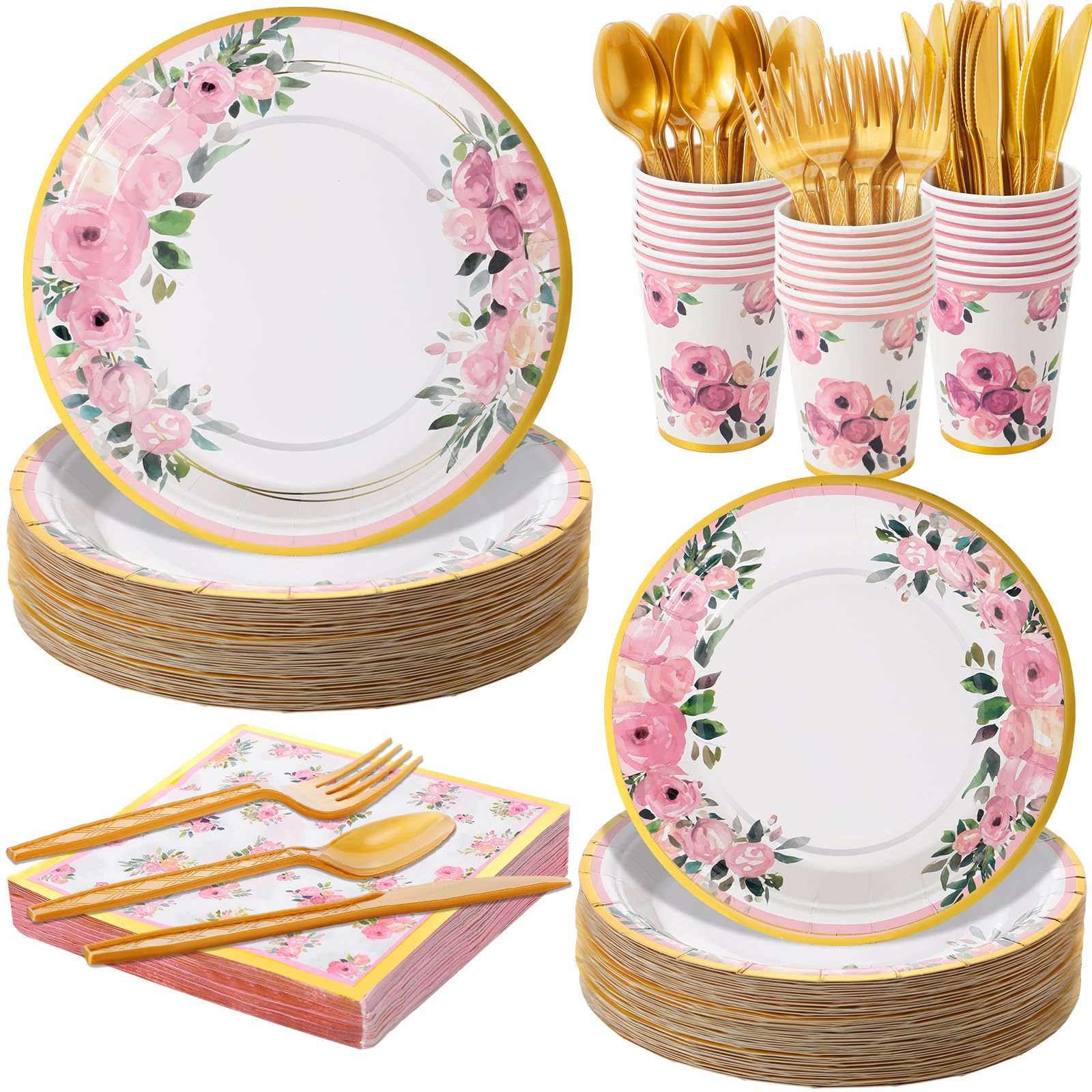 Juego de vajilla de 350 piezas de suministros florales desechables de 9 pulgadas, 7 pulgadas, platos de papel de 9 onzas, vasos de