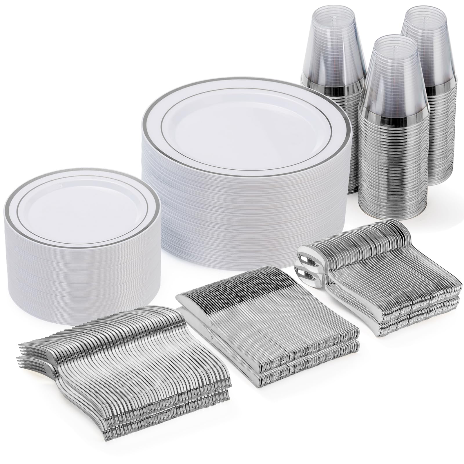 Goodluck Juego de vajilla desechable de 300 piezas para 50 invitados, platos de plástico plateado, platos de ensalada, cubiertos y