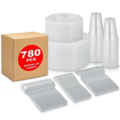Juego de vajilla transparente desechable de 780 piezas para 120 invitados, juego de vajilla de plástico para microondas de 120 pla