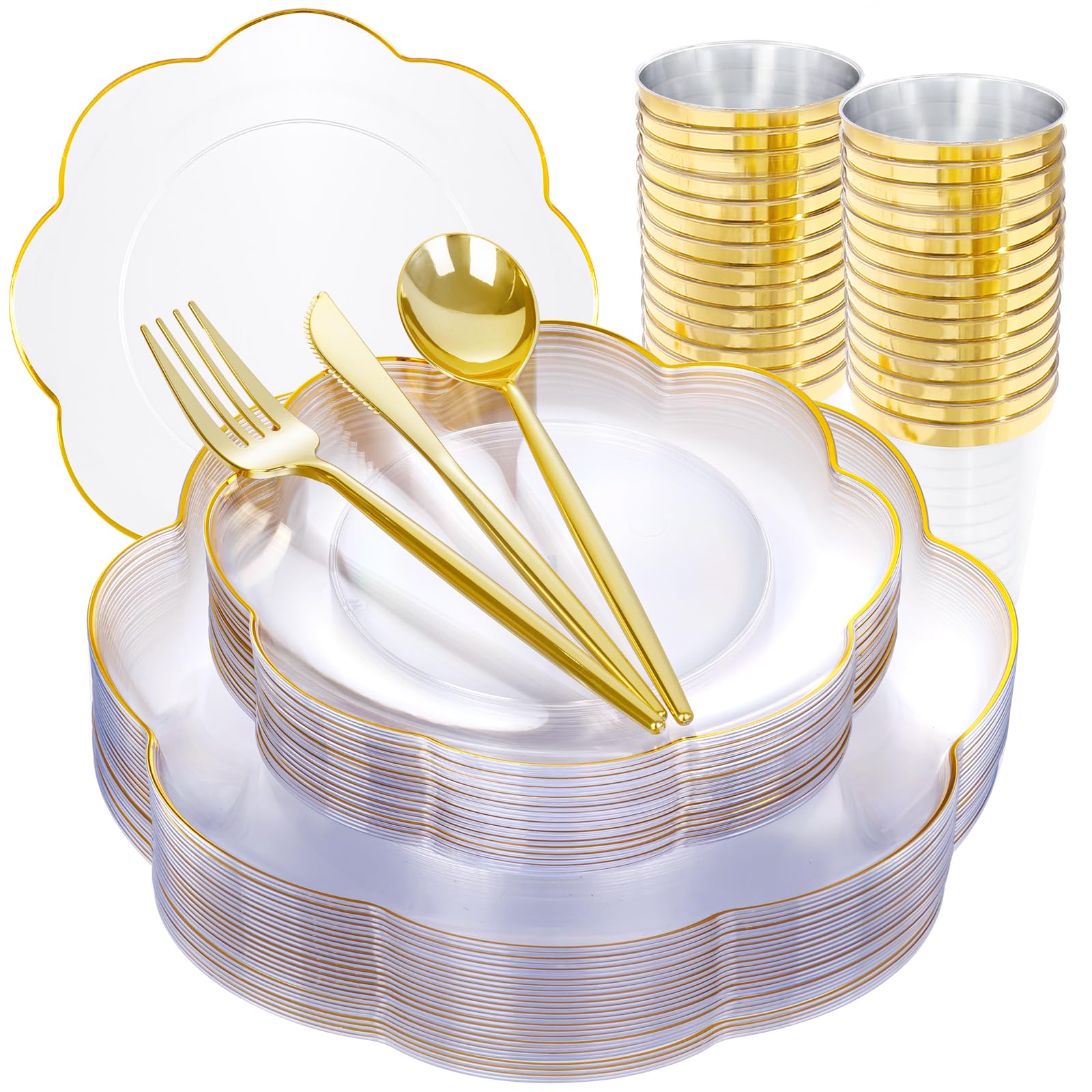 Juego de vajilla desechable de oro transparente de 175 piezas para 25 invitados, platos de plástico para fiestas, bodas, incluye:
