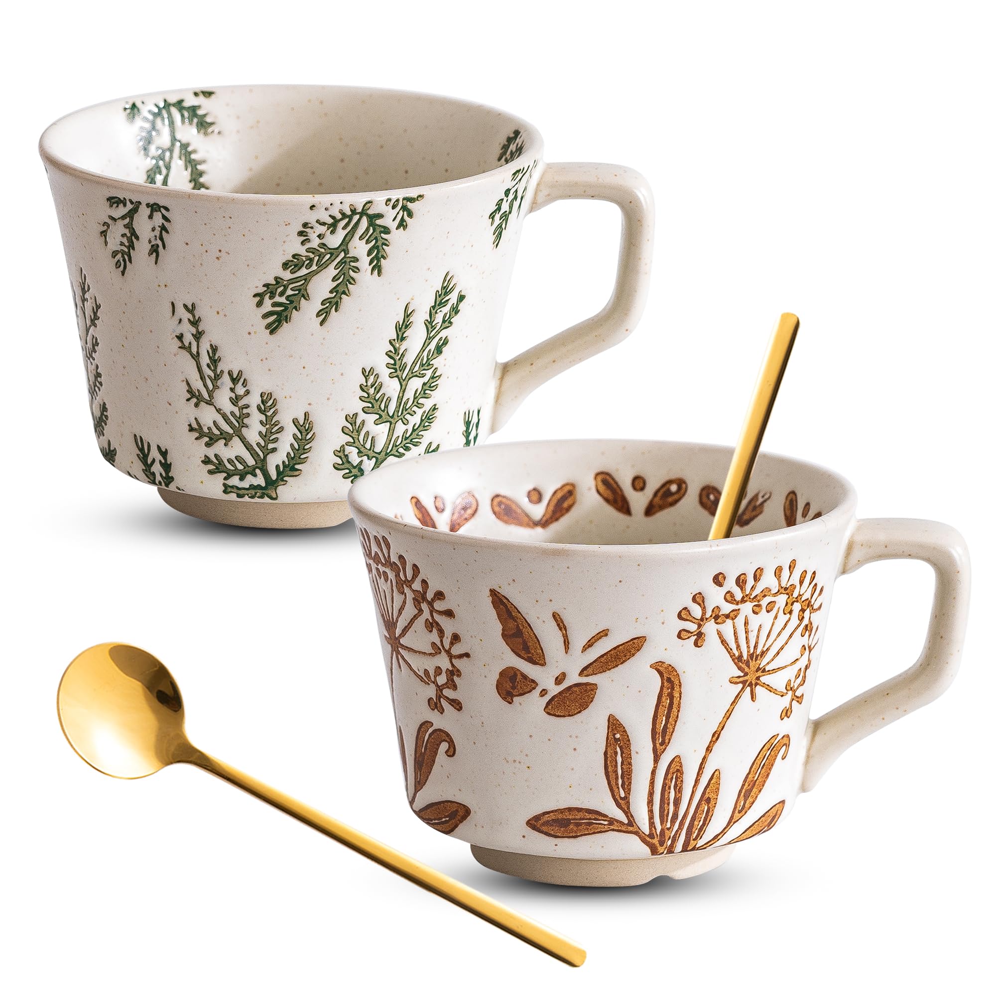 Juego de tazas de café de cerámica, 11 onzas y 2 cucharas, juego de 2 tazas de café, adecuado para americano, bebidas de chocolate