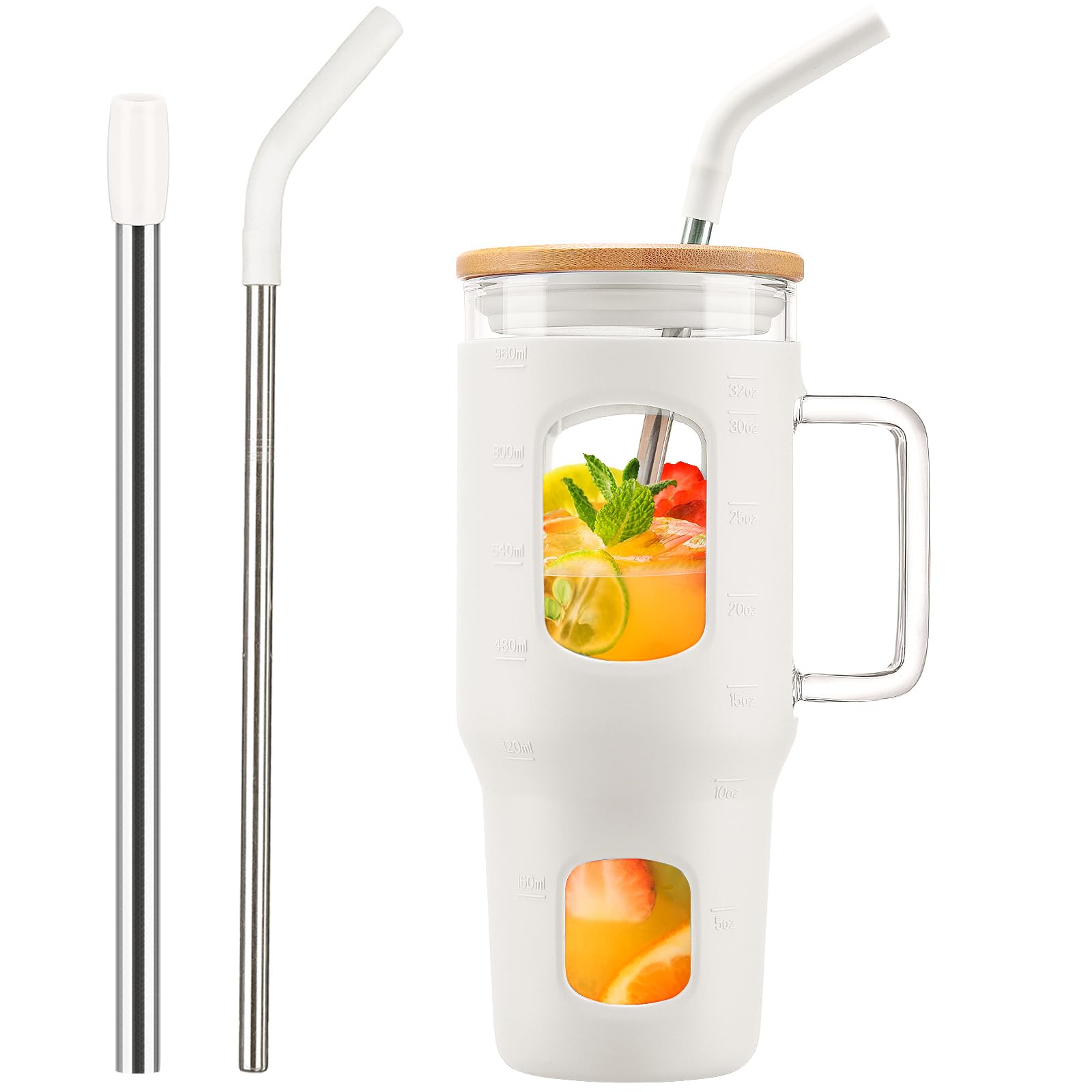 Vasos de vidrio con tapas y popotes de bambú, vaso de 24 onzas con asa, paquete de 2 tarros Mason con tapa y pajita de boca ancha,