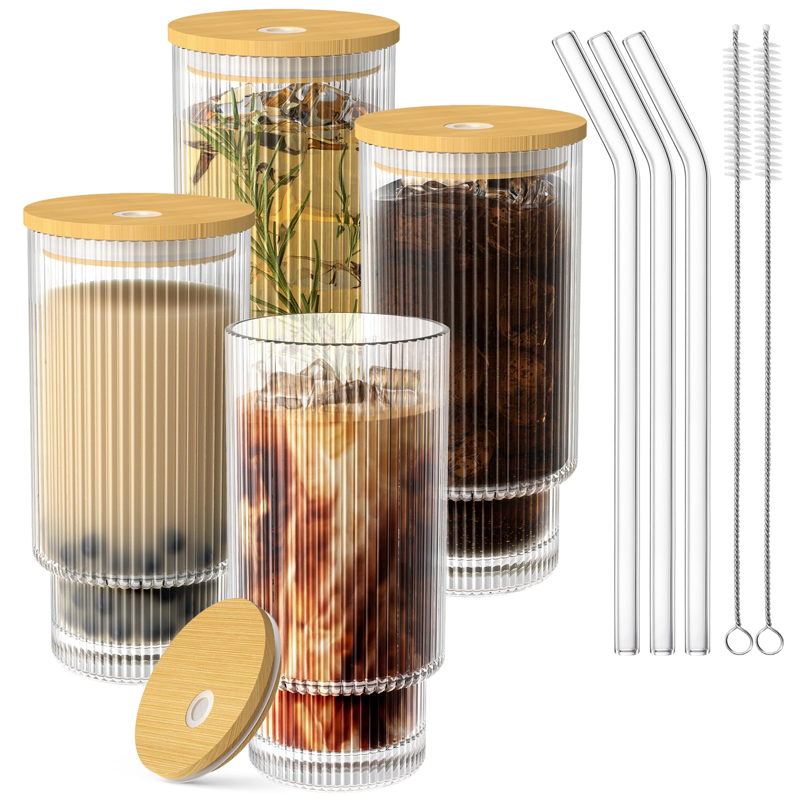 Vasos de vidrio acanalado de 20 onzas con tapas y popotes, 2 vasos de vidrio con popote y tapa, vasos para tazas de café helado, j