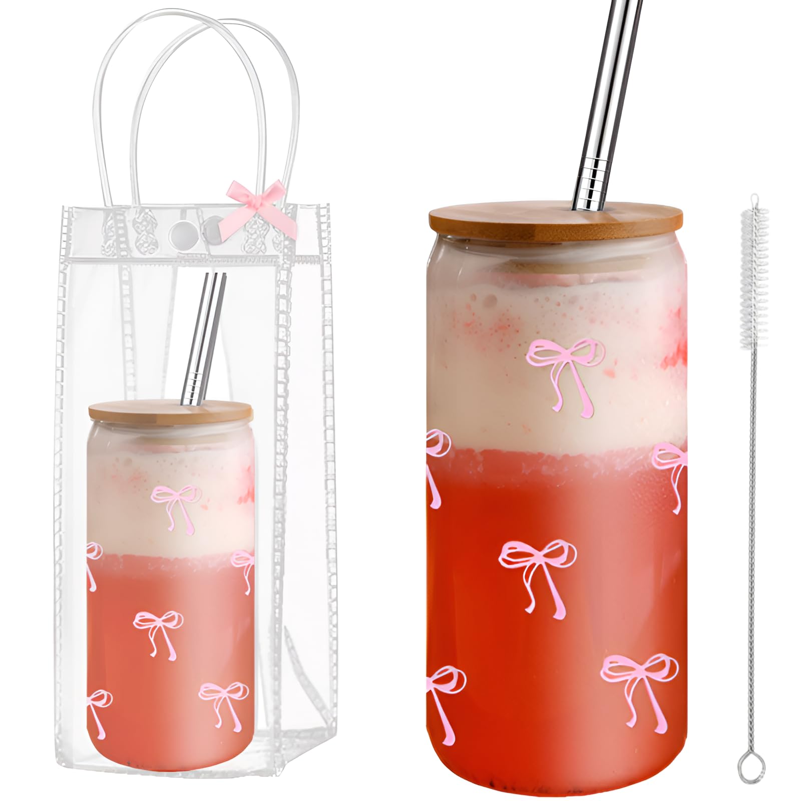 Coquette – Taza de vidrio con lazo con bolsa de regalo transparente, taza de café helado de 16 onzas con tapas y pajitas, vaso de