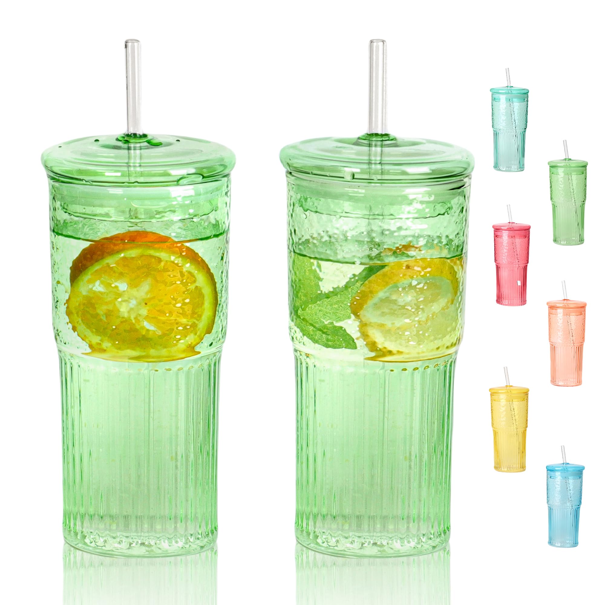 INSETLAN 20oz Ribbed & Floral Glass Tumblers with Lids and Straws, Set of 2 – Clear Iced Coffee Cups, Reusable Drinking Glasses fo