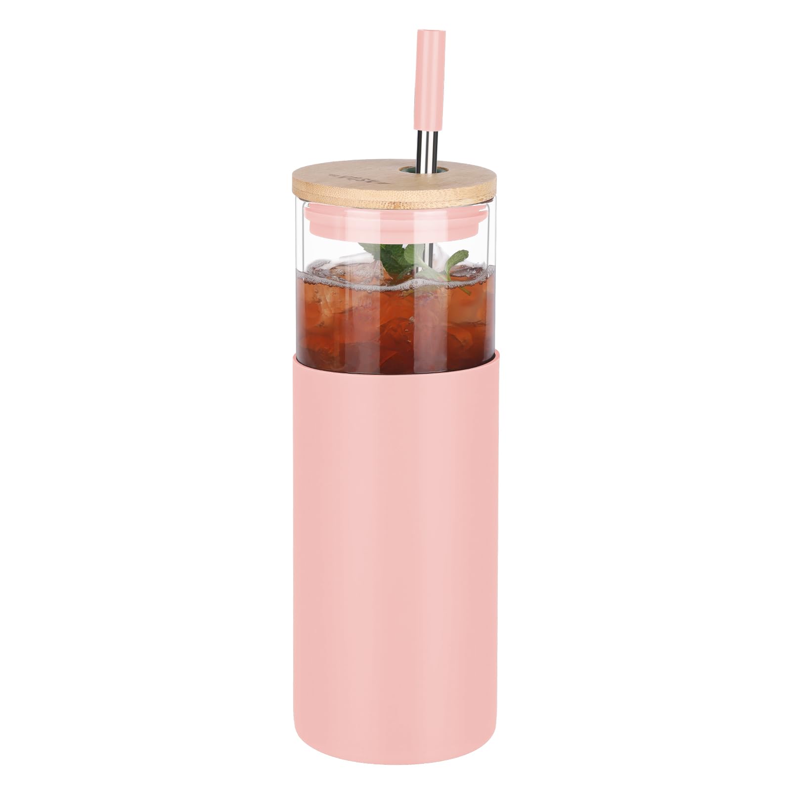 Tronco – Vaso de vidrio de 16 onzas, con funda protectora de silicona, sorbete y tapa de bambú, libre de bisfenol A