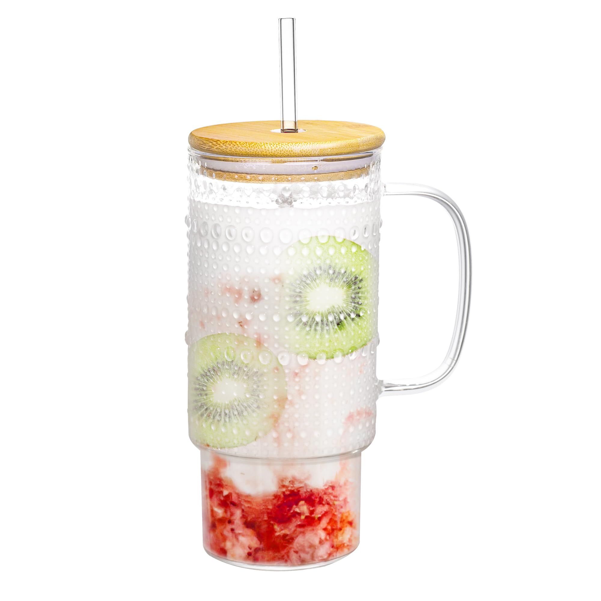 Vaso de vidrio de 32 onzas con tapa y pajilla, vaso de vidrio con cuentas en relieve con asa, tapa de bambú y popote para whisky,