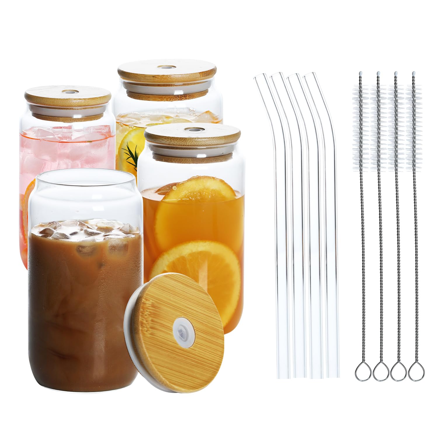 Paquete de 20 vasos de vidrio con tapas acrílicas y pajitas de vidrio, tazas de café helado de 16 onzas, vasos de vidrio transpare