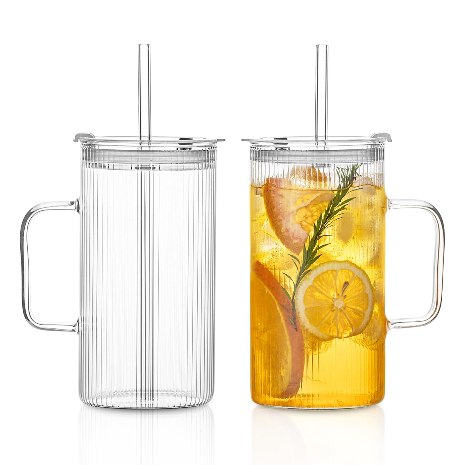 Vaso grande de vidrio acanalado de 26 onzas con asa y tapa, juego de 2, vasos de vidrio transparente con pajitas reutilizables, di