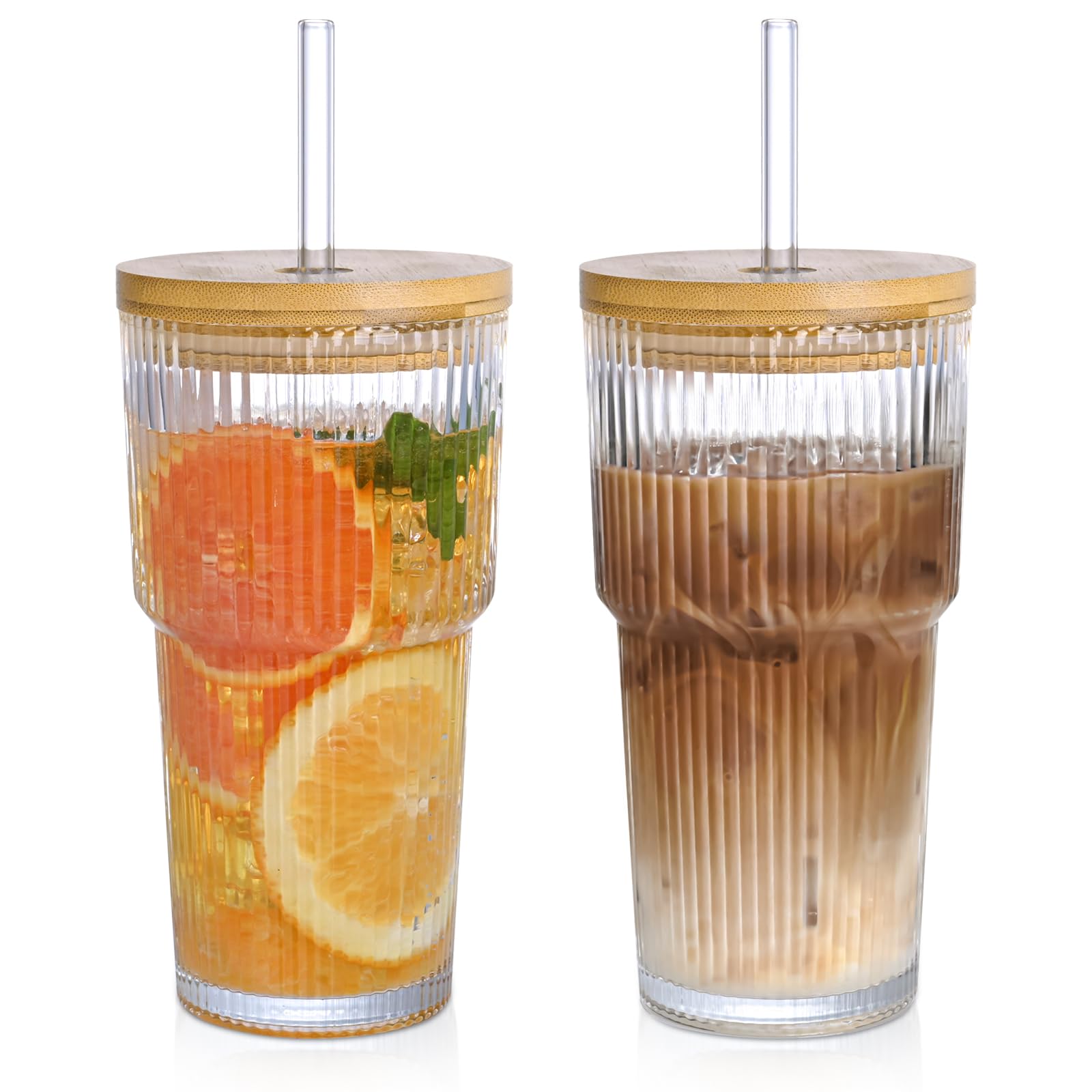 Juego de vasos de vidrio acanalado de 20 onzas con tapas y pajitas de bambú, 2 tazas de café helado vintage para bebidas, jugo, ce
