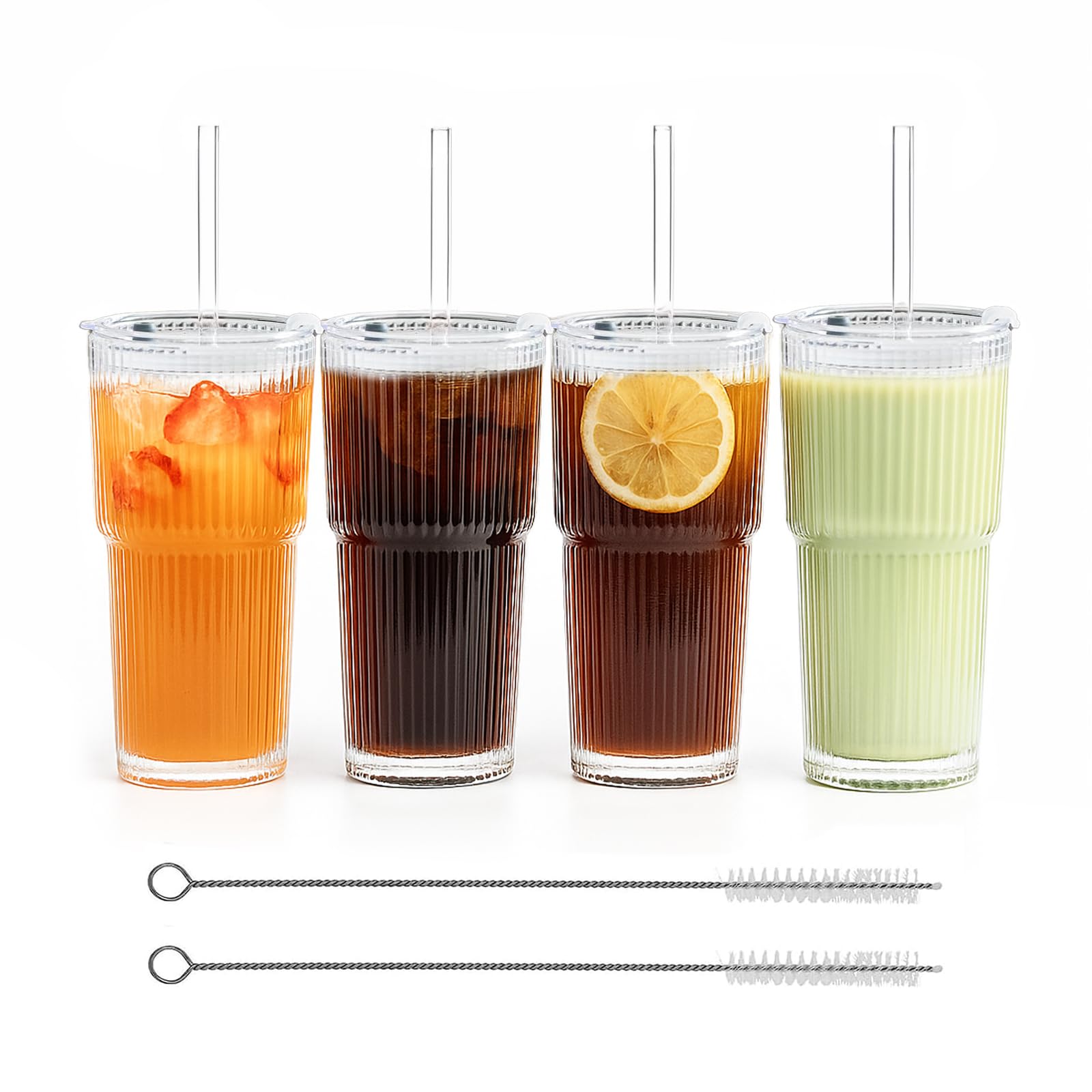 Vasos de vidrio acanalado de 20 onzas con tapas y popotes – Juego de 4 vasos gruesos y duraderos a granel para tazas de café helad
