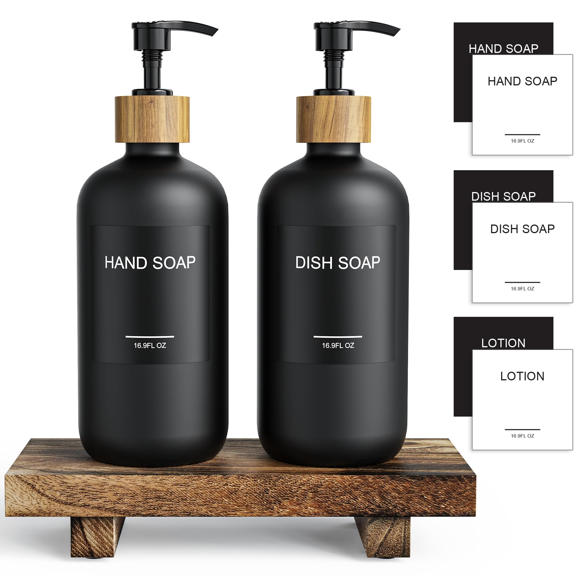 Cisily Juego de dispensador de jabón de cocina negro con bandeja de madera, dispensador de loción de jabón para platos y manos con