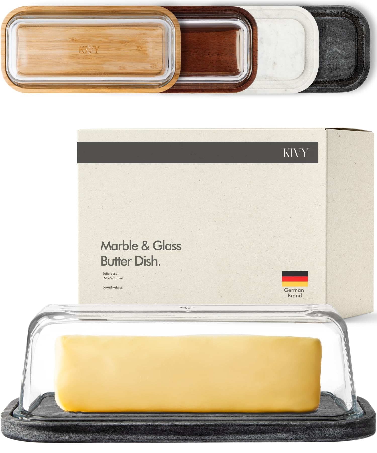 KIVY Mantequillera (mármol negro y vidrio) – Para encimera y estante de puerta de refrigerador – Mantequera de mármol – Mantequera