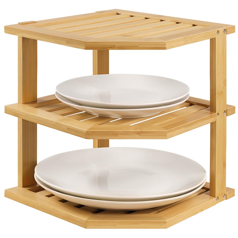 Organizador de platos de bambú, organizador de gabinete de cocina, estante de esquina de 3 niveles para platos, platos y estantes
