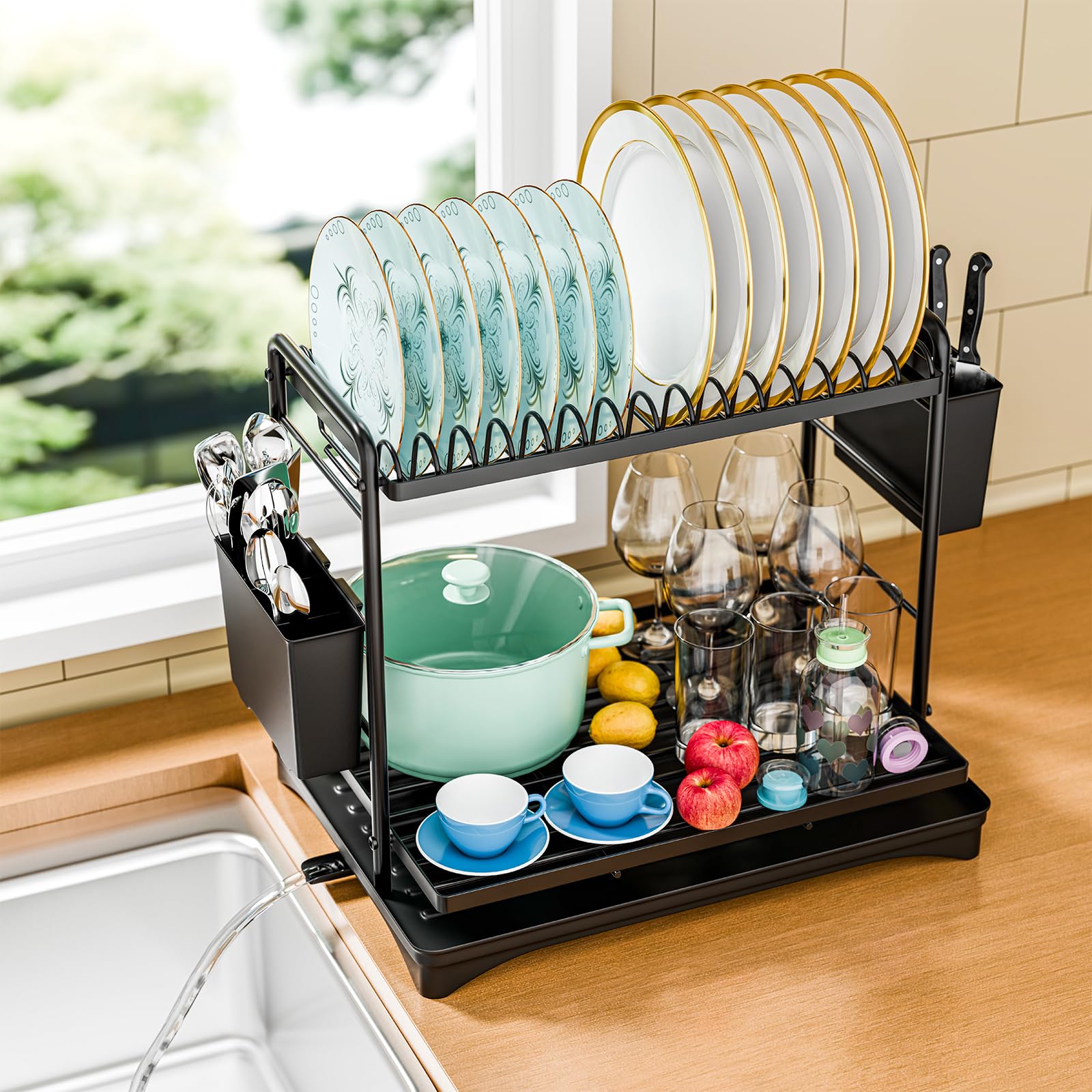 Simple Trending Escurridor de platos para encimera de cocina, organizador de cocina de gran capacidad de 2 niveles y estante de al