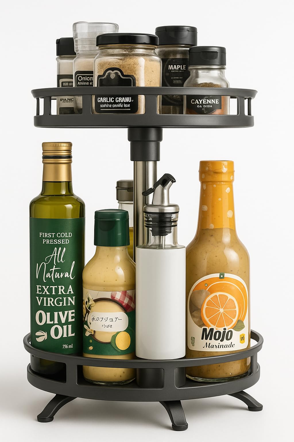 Organizador de especias, estante de condimentos de encimera de 2 niveles con estante inferior de rotación de 90° con barandilla el