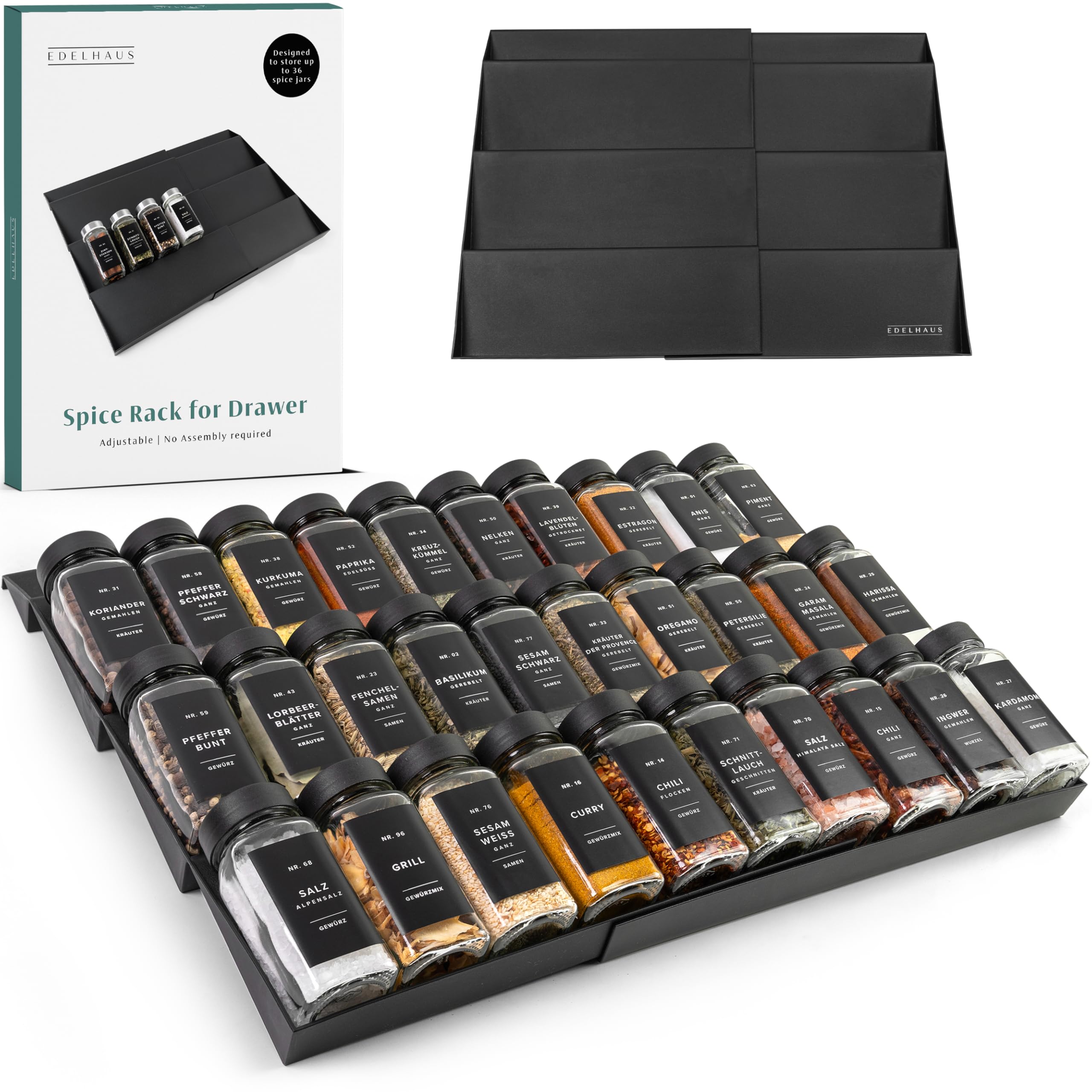 Organizador de cajones de especias: estante de especias expandible para cajón, organizador de condimentos negro para cajón organiz