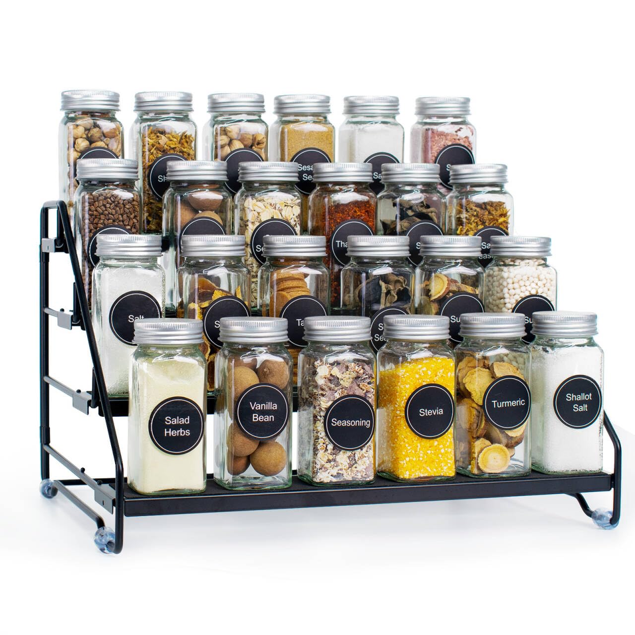 New England Stories Juego de estante giratorio para especias con 25 tarros de especias, organizador de torre de especias de cocina