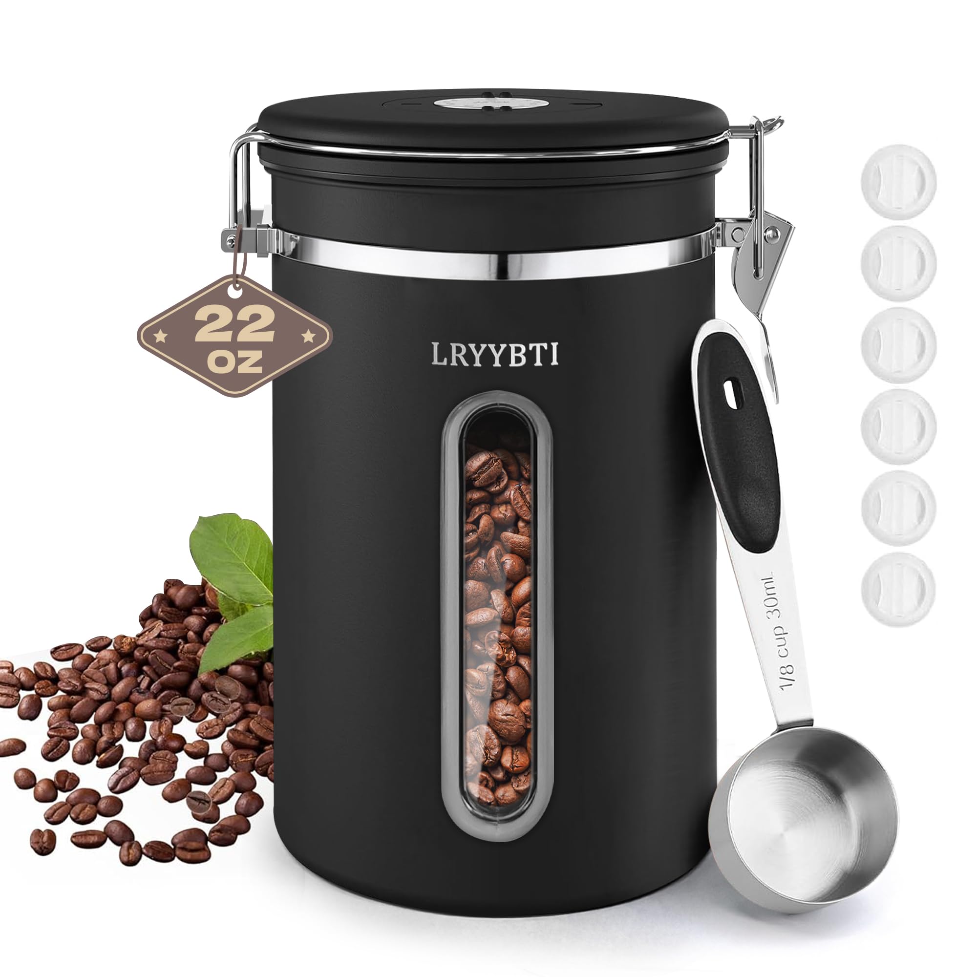 Recipientes de café con ventana, tapa hermética y cuchara de acero inoxidable para almacenamiento de granos de cocina (22 onzas/ne