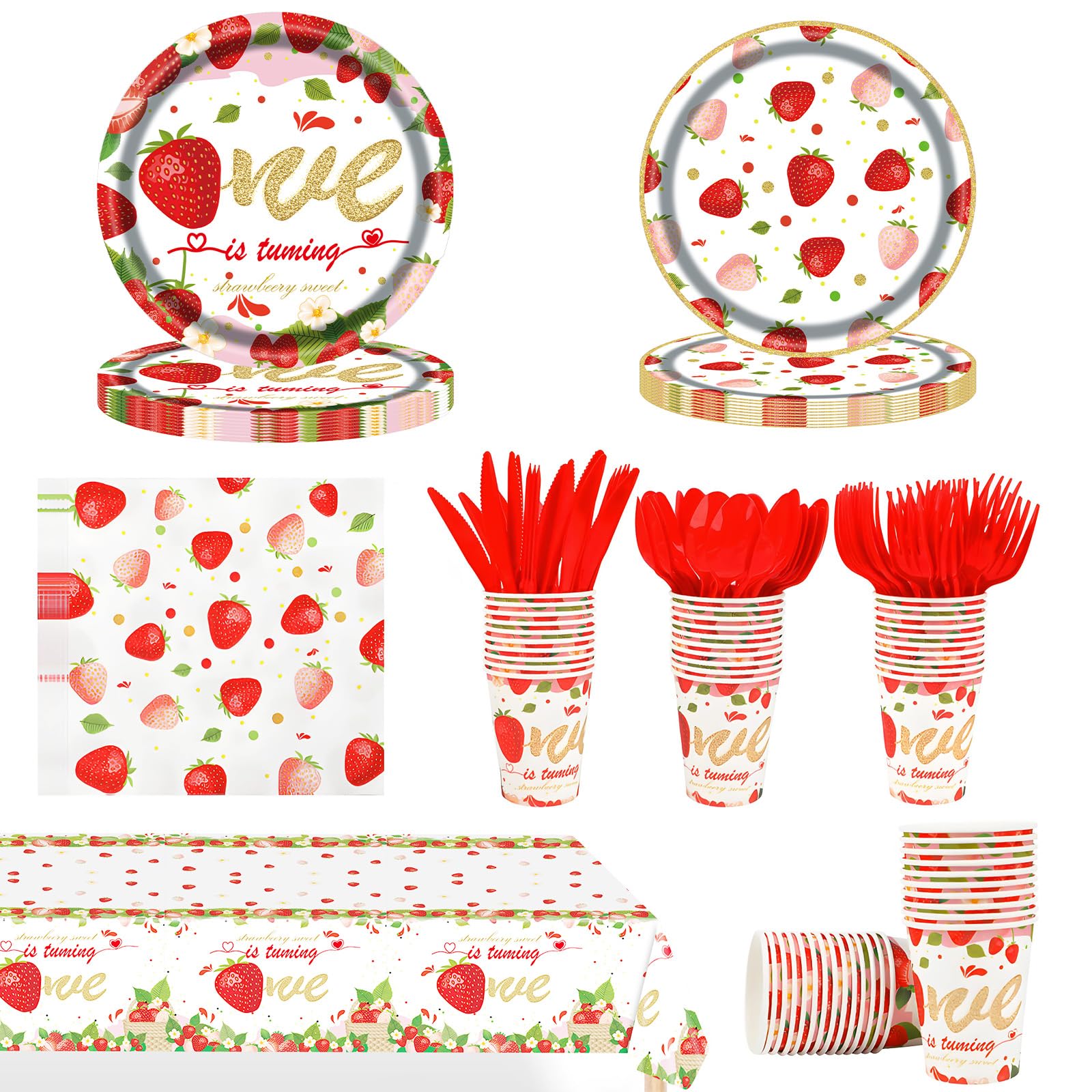 OuMuaMua 177 platos de fiesta de cumpleaños de fresa, servilletas, pancartas, suministros de frutas de verano, juego de vajilla de
